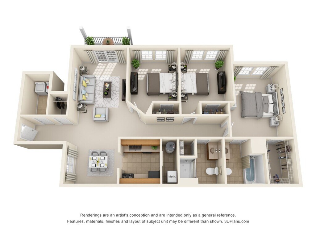 The Three Bedroom plan is an exceptionally attractive home. Situated to allow for the most privacy possible each incredibly spacious apartment features private porches and patios contemporary style and an open flow that makes you feel right at home. Escape from it all and live the life you've dreamed of without sacrificing the conveniences and luxuries you deserve. If you're looking for an immense amount of space you'll find it in our Three Bedroom units.
