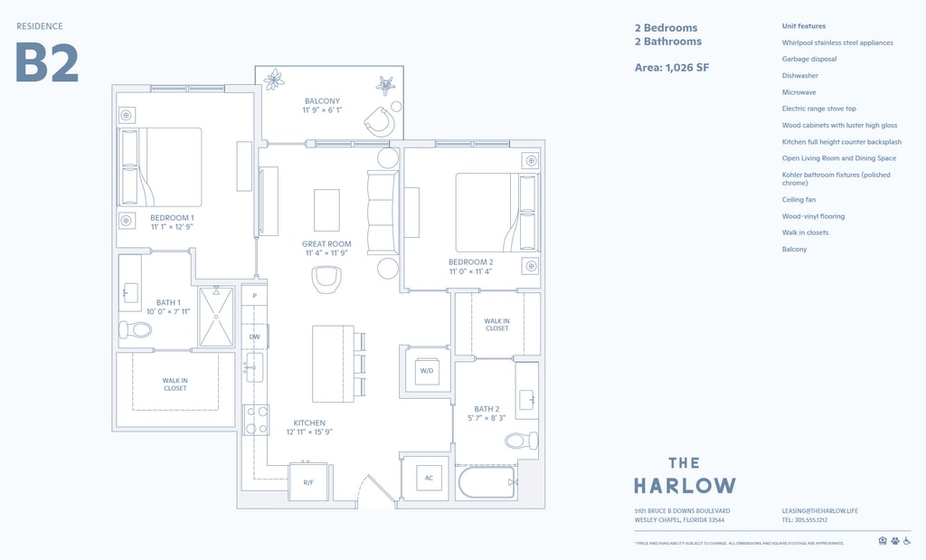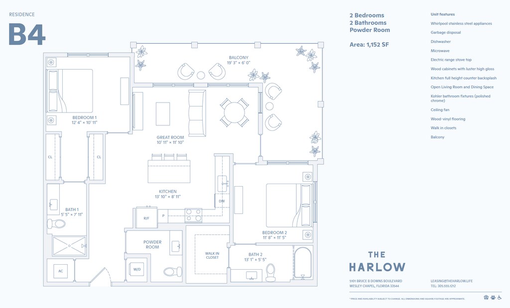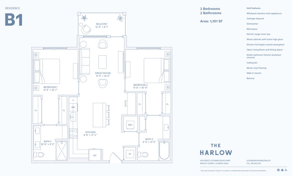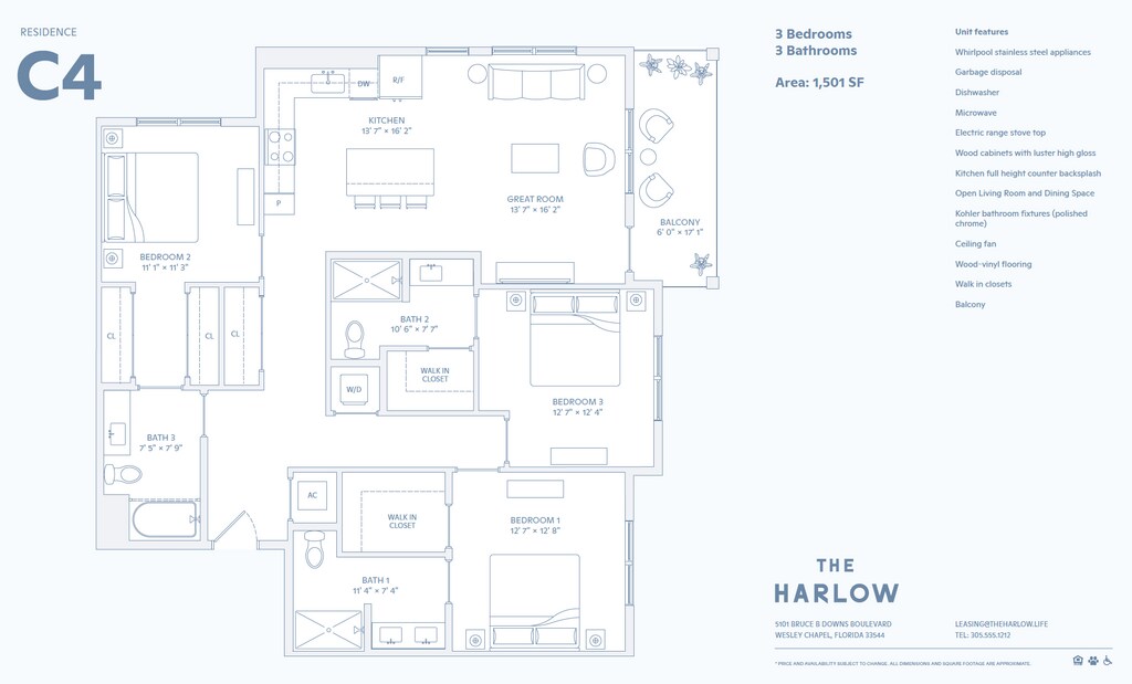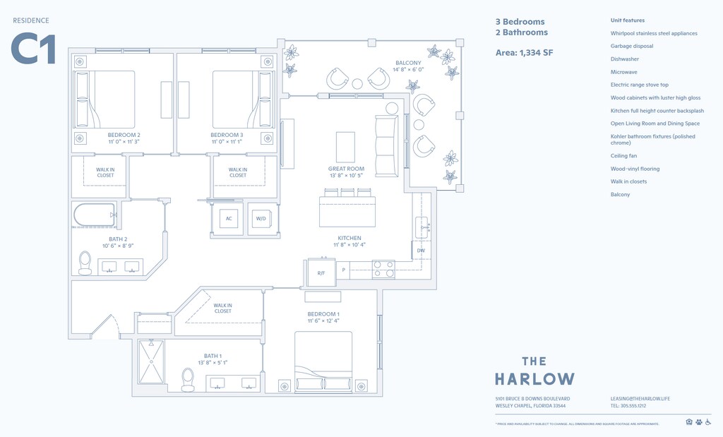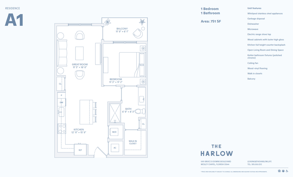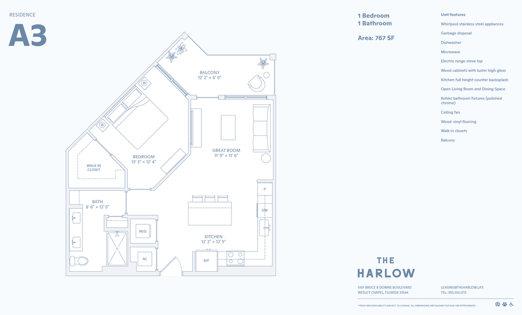 Step into a world of effortless sophistication, where seamless harmony defines every aspect of life. Boasting beautiful modern interior finishes, a spectacular amenity package, and convenient walkable retail options that you won't find anywhere else. Our community located in Wesley Chapel, FL is a curated blend of architectural elegance and natural beauty thoughtfully curated for a refined living experience. Our community features brand new 1, 2, and 3-bedroom apartment homes, all with custom two-tone wood cabinetry, GE stainless steel appliances, wood vinyl flooring, and designer finishes. You can also enjoy our fully-equipped clubhouse, co-working spaces, state-of-the-art fitness center, dog park, and a pool with a sundeck. Stop by and see why living at The Harlow is life with just the right amount of everything.