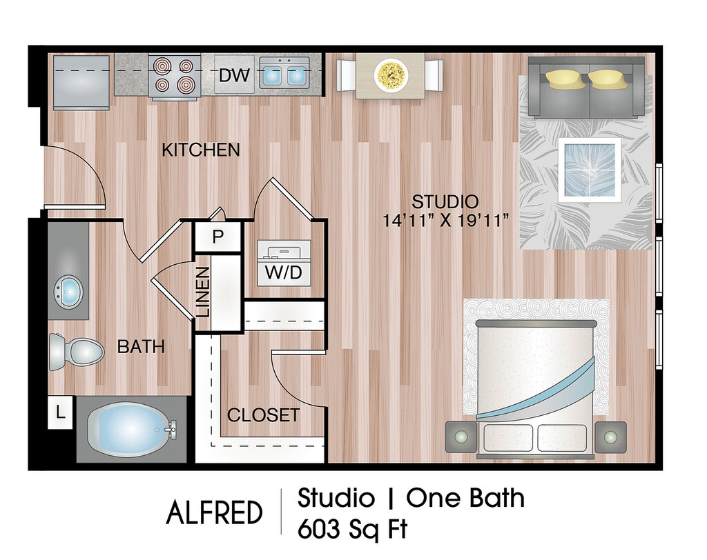 Alfred - Floorplan 1 Apartment Unit: 01-542Apartment Model: Alfred$2,685Studio, 1 Bath, 603 sq ftAvailable November 23, 20251 Bedroom