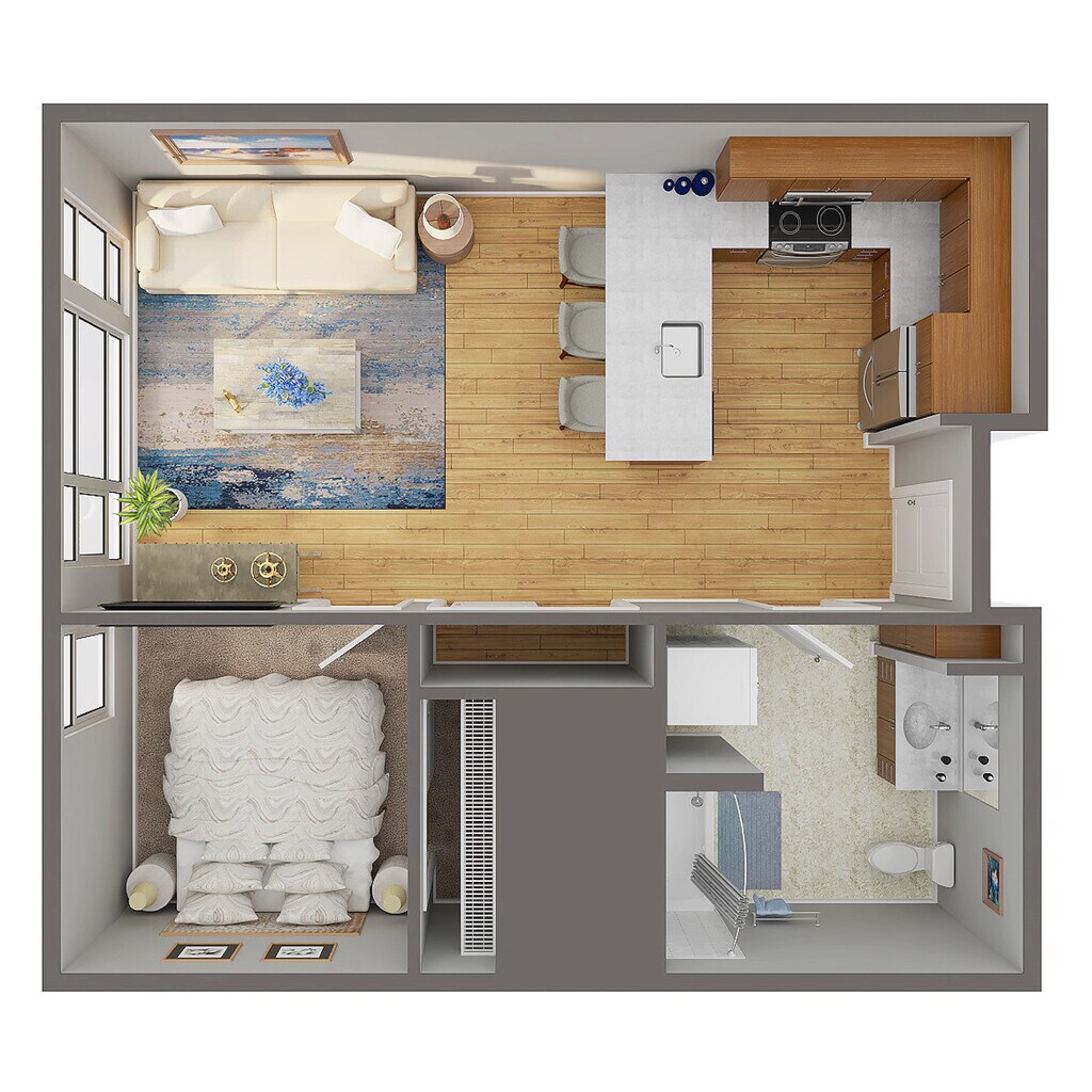 Studio - C - Floorplan 11 Apartment Unit: 308Apartment Model: Studio - C$1,817Studio, 1 Bath, 490 sq ftAvailable NowFloorplansPhotos![]()