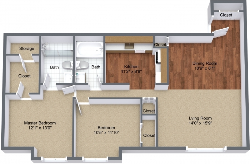 Two Bedroom, One Bath - Floorplan 1 Two Bedrooms, Two Baths
