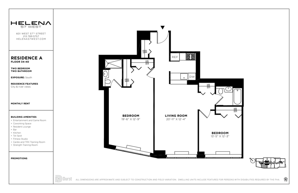 HELENA 57 WEST offers a range of spacious studio, one and two-bedroom layouts, complimented by sweeping views that effortlessly integrate indoor and outdoor living. Eco living is integrated throughout the building, creating a unique ambiance that fosters resident wellness and vitality. Expansive interiors, thoughtfully-curated materials and exclusive amenities support a harmonious resident lifestyle. A balanced offering of amenities and events provide resident convenience, encourage social interaction, and promote wellbeing. HELENA 57 WEST transforms green living by carefully harmonizing environmental initiatives with resident comfort. A sustainable vision that sets a new standard in environmental responsibility, the building is interlaced with green initiatives that promote healthy living. FARE Act Disclosure. This listing is intended to be used by prospective renters and may not be republished without the prior written consent of The Durst Organization. Absent an express written agreement or acknowledgment to the contrary, The Durst Organization and its affiliates (1) do not utilize the services of third-party brokers or agents in connection with the rental of residential apartments and (2) will not assume responsibility for any brokerage fees incurred by a prospective renter. The Durst Organization and its affiliates will not charge or collect fees from a prospective renter except for such fees as permitted by law and disclosed to the prospective renter.