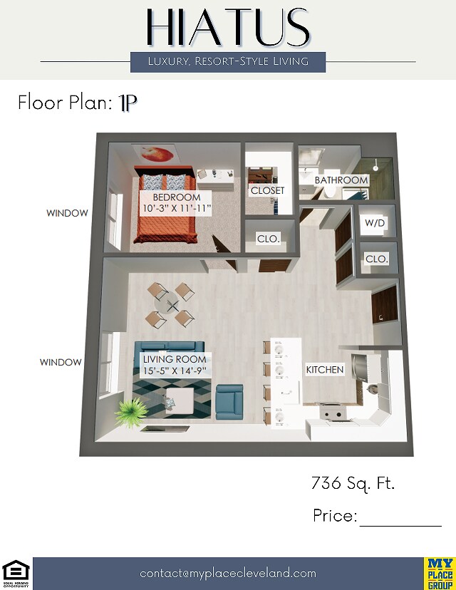 Apartment Model: 1WFrom $1,499Studio, 1 Bath, 415-614 sq ftAvailable August 1, 2026Floor plans are artist's rendering. All dimensions are approximate. Actual product and specifications may vary in dimension or detail. Not all features are available in every rental home. Please see a representative for details.