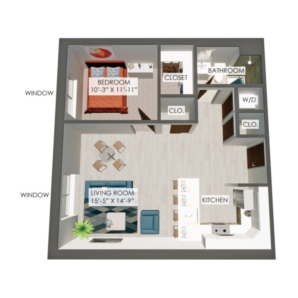 1W - Floorplan 1 Apartment Unit: 204Apartment Model: 1W$1,550Studio, 1 Bath, 609 sq ftAvailable August 1, 20261 Bedroom