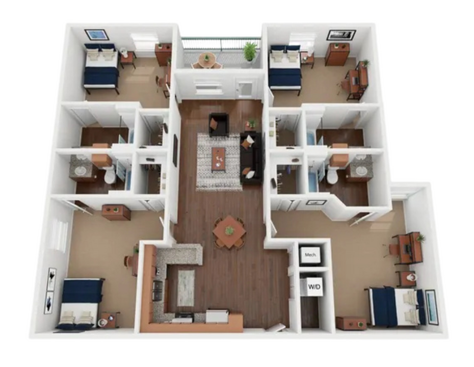 Apartment Model: 4X4$8174 Bedroom, 4 Bath, 1356 sq ftAvailable August 17, 20264X4 - Floorplan 1 Apartment Unit: PrivateApartment Model: 4X4$8174 Bedroom, 4 Bath, 1356 sq ftAvailable August 17, 2026