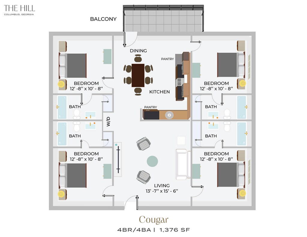 Welcome to The Hill off-campus college living apartments just steps from Columbus State University. College should be the best years of your life and where you live during those years should be nothing but best too! The Hill is the perfect place to call home, offering fully furnished apartments, roommate matching with beautiful features and amenities. When you're not studying or sleeping, you will LOVE hanging out with your friends at the pool, working up a sweat in the fitness center or playing with your furry best friend in the dog park. You won't find a better off-campus college living near Columbus State University. See what sets us apart and tour today!