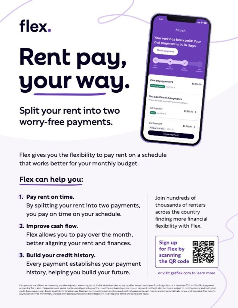 - Split your rent into two payments and build credit with Flex