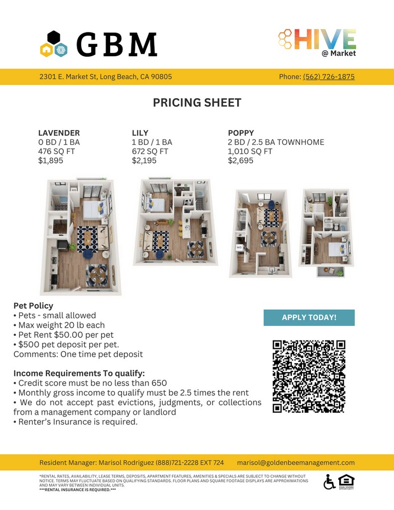 Renovated 1 BD Apartments Available-( 100% off First Month Rent) Welcome to The Hive @ Market located in beautiful Long Beach, California. The Hive is set in an area known for its famous landmarks and peaceful atmosphere.the Hive is the perfect apartment community for any lifestyle. Long beach is a thriving beach city, home to the historic Queen Mary, Los Cerritos Ranch, El Dorado Park, and Long Beach Aquarium. Features: Spacious Closets, Stainless Steel Appliances, Updated Cabinets and Counter Tops, Mirrored Closets Doors on selected units, Newly Renovated Units*, Ceiling Fans, Wood-Like Flooring, Private Balcony or Deck, Air Conditioning*. Community Amenities: Assigned Parking, Picnic Area with Barbecue, Onsite & On-Call Maintenance, State-Of-The-Art Fitness Center, Recreational Parks Nearby, Laundry Facility, Shimmering Swimming Pool, Close to Shopping, and Fantastic Dining Options, Gated Access, Dog park. Pet Policy Pets - small allowed, Max weight 20 lb each, Pet Rent $50.00 per pet, $500 pet deposit per pet. Comments: One time pet deposit Income Requirements: Total Income, combined, needs to be a minimum 2.5x the rental amount Don't miss the opportunity to call The Hive @ Market your new home!