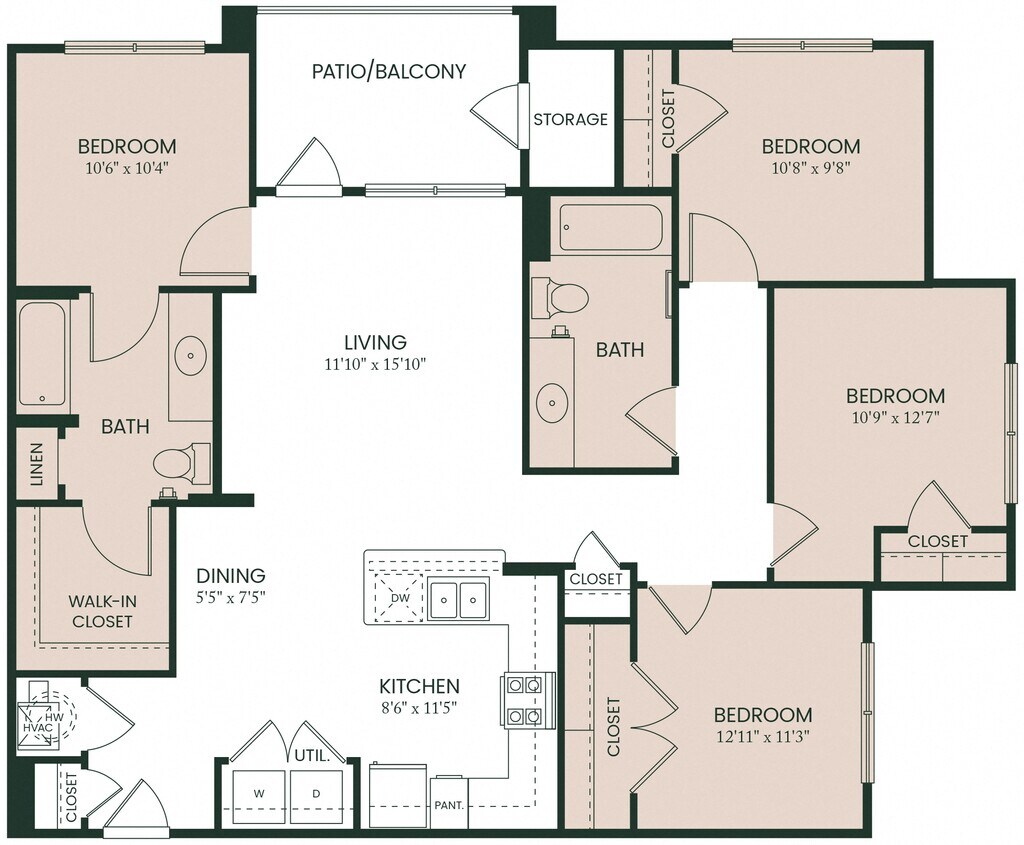 - 4 Bedrooms- Floorplan D1- From $1,8824 Beds, 2 Baths, 1304 sq ftAvailable Now- Model Gallery- Floorplans- Availability Details- Availability Date - Unit - Sq Ft - Available Now - D1 - 1304 sq ft Apartment Model: D14 Bedroom, 2 Bath, 1304 sq ftAvailable Now![]() - D1 - Floorplan 1 ![]() - D1 - Floorplan 2