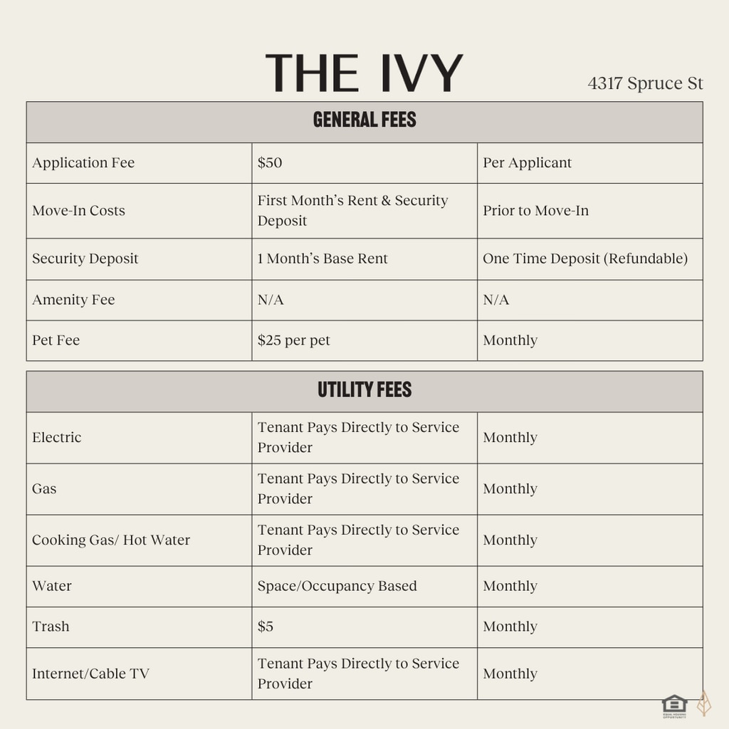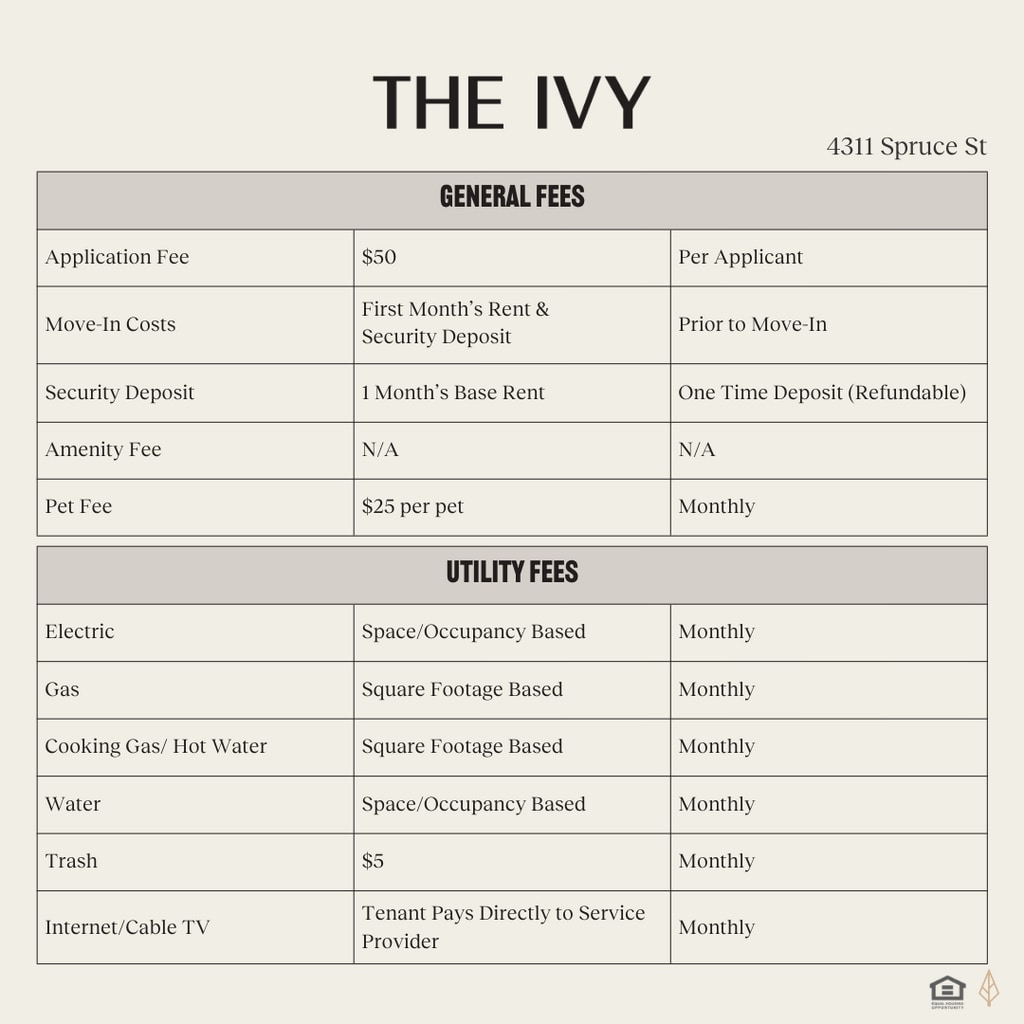 Enjoy all University City has to offer from The Ivy! Discover a range of Studio, 1-Bedroom, and 2-Bedroom apartments located at 4311-21 Spruce Street, steps from UPENN, the Hospital of University of Pennsylvania and Clark Park. The Ivy provides residents with an exceptional living experience, surrounded by an abundance of greenspaces and a thriving dining scene. Your neighborhood will offer a culinary adventure for everyone, from cozy coffee shops and trendy cafes to international restaurants. Living in Spruce Hill, there is no shortage of green space. Close to both Clark Park and Locust Walk, you have sprawling lawns, shady trees, and community events right outside your door. It's the perfect spot for picnics, strolls, or just soaking in the outdoors. Convenience is key, with easy access to central University City or Center City via SEPTA's bus routes (Route 21, 40, or 42) and Baltimore Avenue's trolley line (Trolley Route 34). The proximity to 30th Street Station ensures effortless regional travel. Beechwood Management is proud to lease and manage this exceptional property and would be happy to answer any questions you have. See our contact information and website below - we're here to make your living experience extraordinary! **LEASING SPECIAL: Listing price is inclusive of a $100 concession for qualifying applicants.