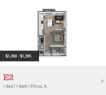 E2 - Floorplan 2 Apartment Unit: 5107Apartment Model: E2$1,230Studio, 1 Bath, 570 sq ftAvailable NowApartment Unit: 5207Apartment Model: E2$1,210Studio, 1 Bath, 570 sq ftAvailable NowApartment Unit: 5407Apartment Model: E2$1,265Studio, 1 Bath, 570 sq ftAvailable NowFloorplan E1