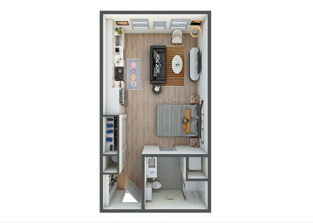 Apartment Model: E1From $1,082Studio, 1 Bath, 495 sq ftAvailable November 14, 2025Floor plans are artist's rendering. All dimensions are approximate. Actual product and specifications may vary in dimension or detail. Not all features are available in every rental home. Prices and availability are subject to change. Base rent is based on monthly frequency. Additional fees may apply, such as but not limited to package delivery, trash, water, amenities, etc. Deposits vary. Please see a representative for details.