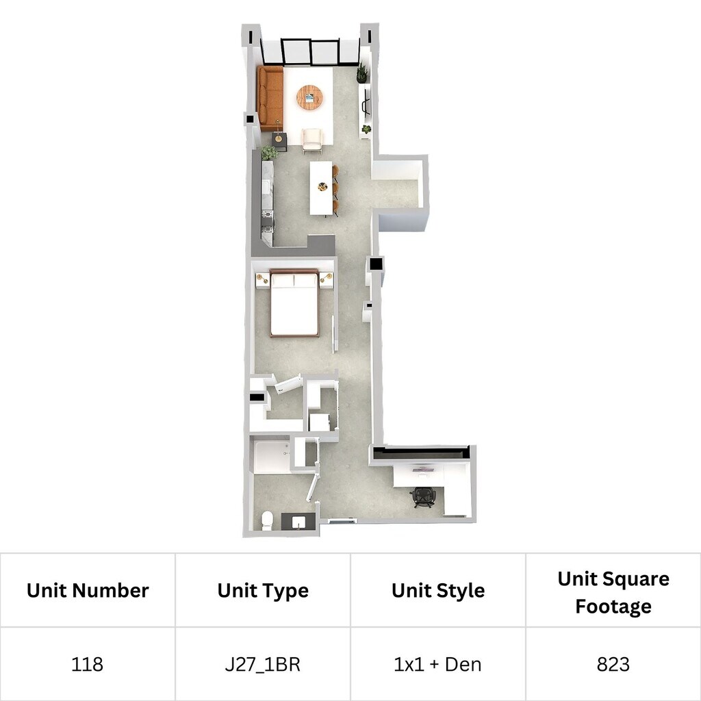 J27 1 Bed, 1 Bath - Floorplan 1 Apartment Unit: 118Apartment Model: J27 1 Bed, 1 Bath$2,6001 Bedroom, 1 Bath, 823 sq ftAvailable December 1, 2025