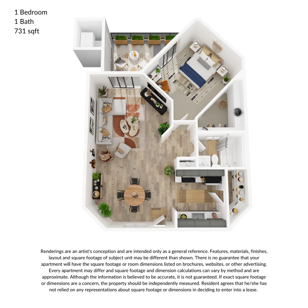 Apartment Model: One Bedroom One Bath UpgradedFrom $1,3121 Bedroom, 1 Bath, 731 sq ftAvailable NowFloor plans are artist's rendering. All dimensions are approximate. Actual product and specifications may vary in dimension or detail. Not all features are available in every rental home. Prices and availability are subject to change. Base rent is based on monthly frequency. Additional fees may apply, such as but not limited to package delivery, trash, water, amenities, etc. Deposits vary. Please see a representative for details.