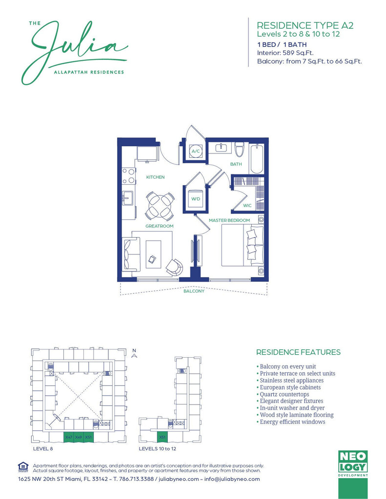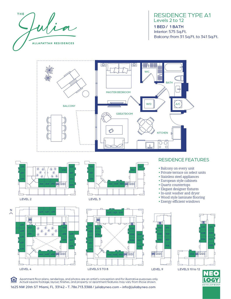 The Julia Residences offers 1 to 2 Bedroom apartments starting from $2,065 and having 573–866 sq ft. Here is the current pricing and availability: