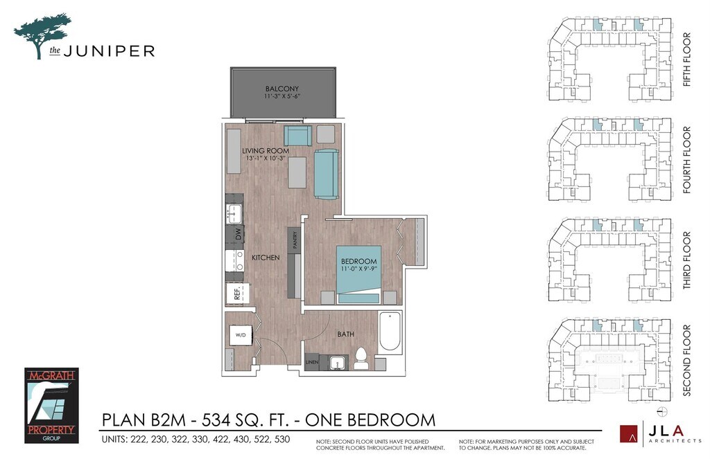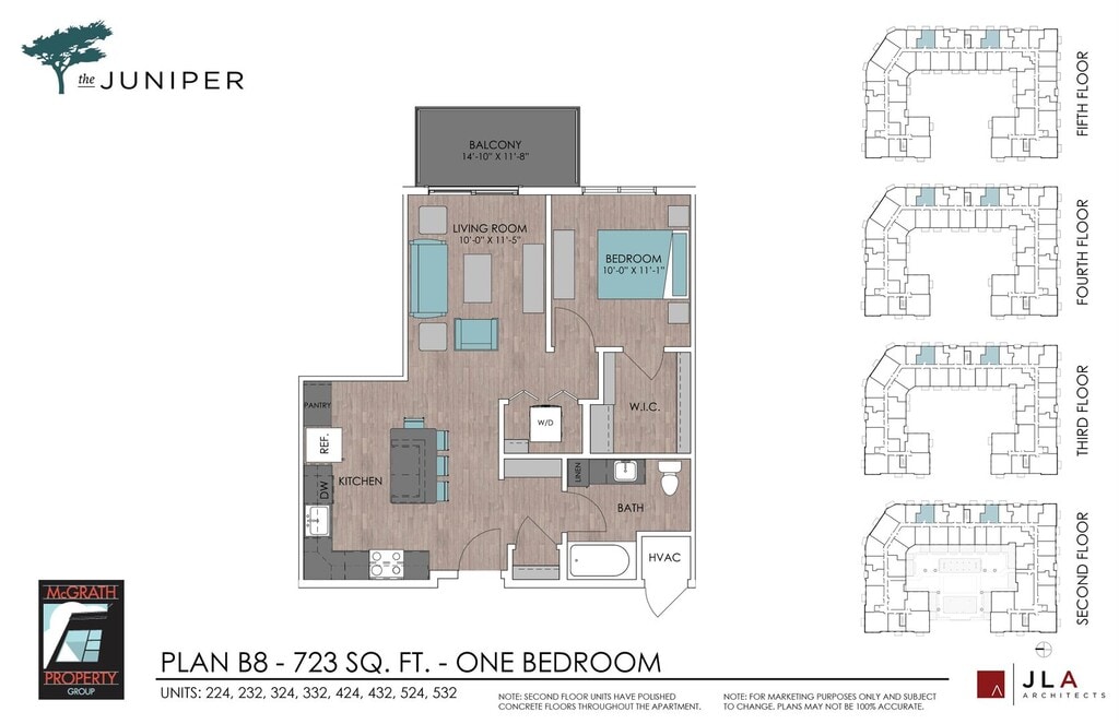 The Juniper offers 1 to 2 Bedroom apartments starting from $1,410 and having 534–1,245 sq ft. Here is the current pricing and availability: