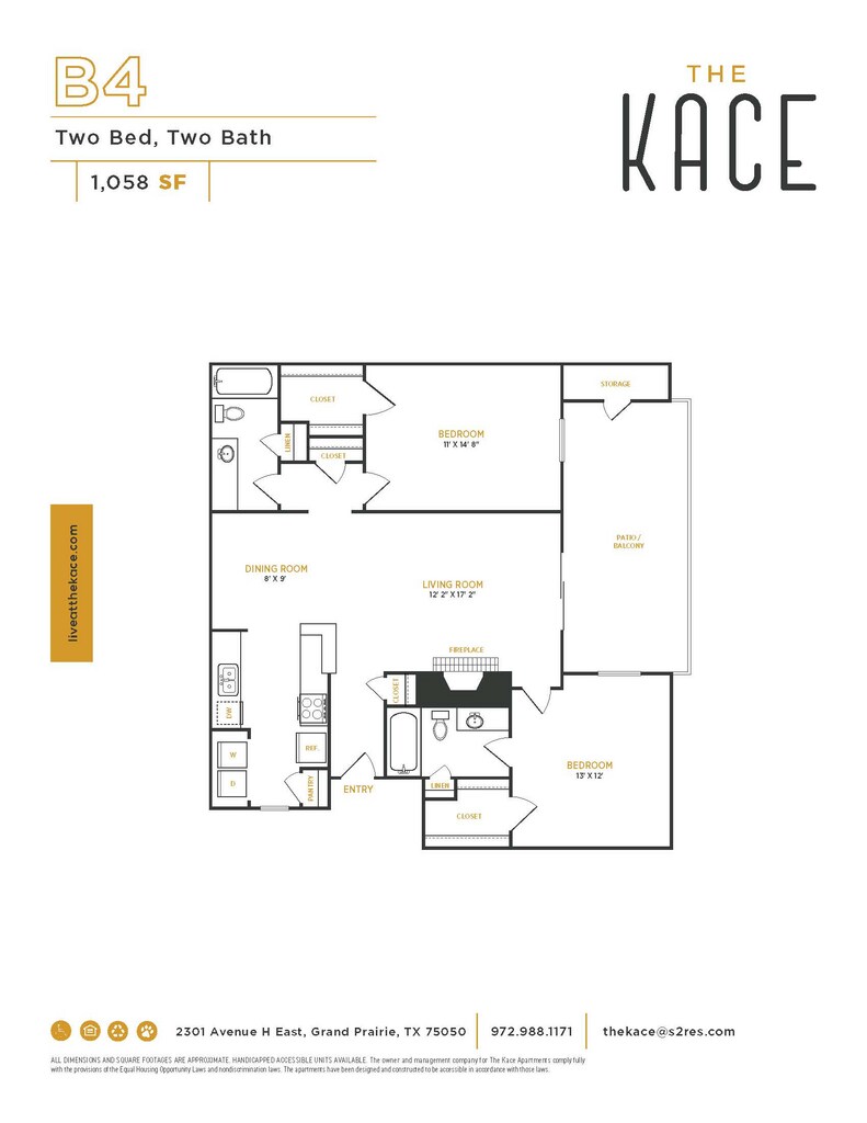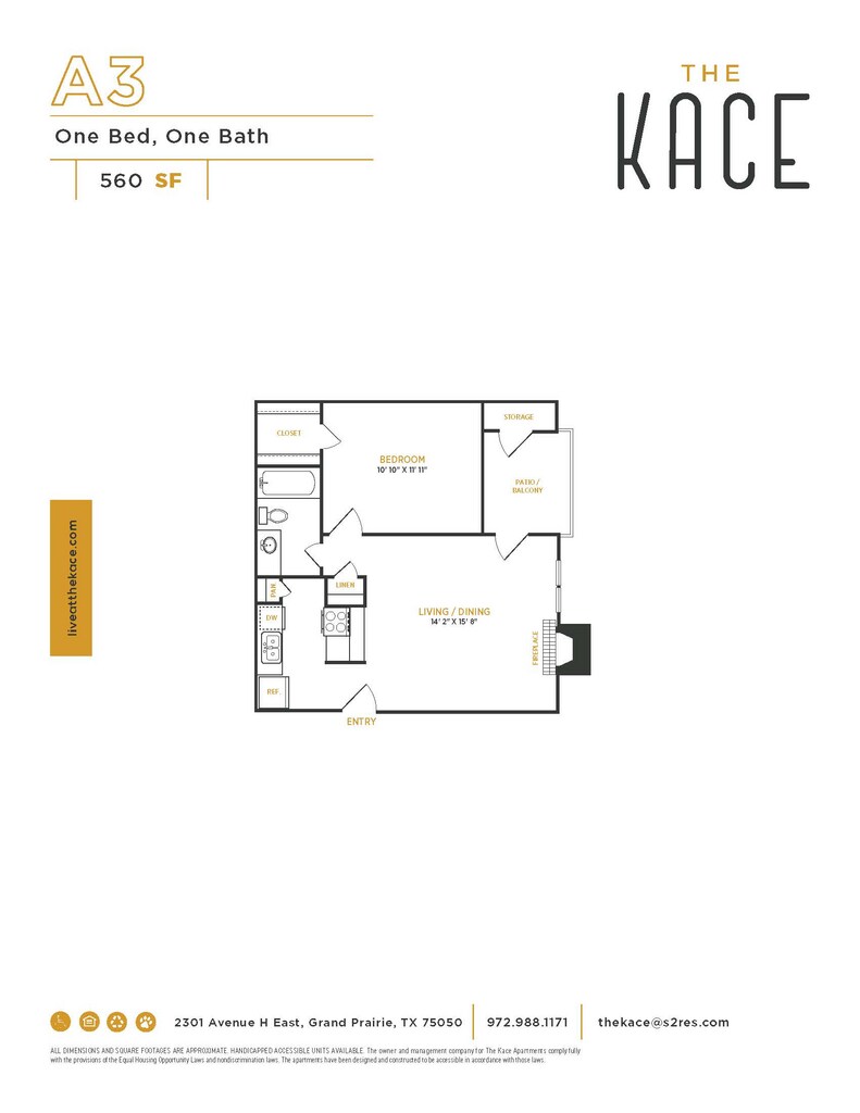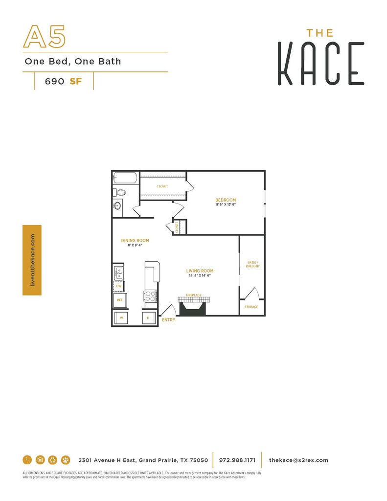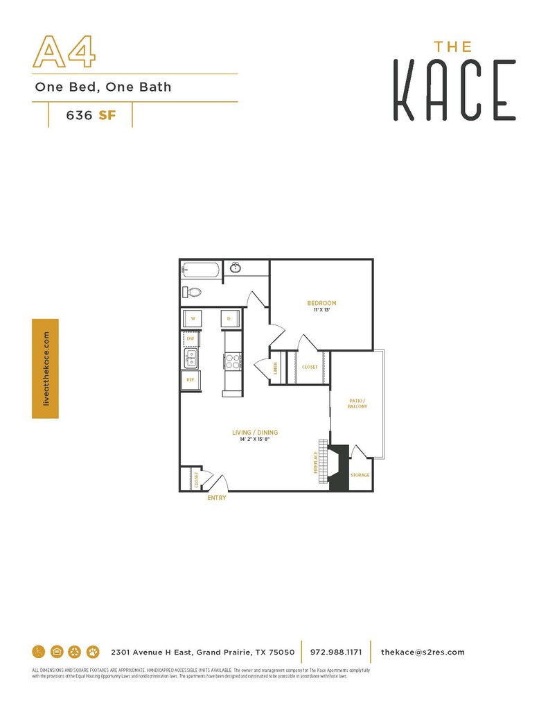 Located in the heart of the Metroplex, The Kace Apartments in Grand Prairie, TX offers a relaxing, charming community in a convenient yet desirable location. Experience the perfect balance of tranquil living and close proximity to major employers, shopping, and dining. Our state-of-the-art fitness center offers you the chance to workout steps from your apartment home or take a light jog through our scenic grounds. You can even escape from the heat at one of our three sparkling pools, entertain friends at our pool side grilling station, or play a game of chess or checkers while grilling out poolside. A perfect blend of quality, convenience, and style you do not want to miss. In addition to the community amenities, The Kace Apartments offers a variety of one and two-bedroom floor plans sure to meet any need. Choose from a renovated or non-renovated home with amazing view options and great locations.