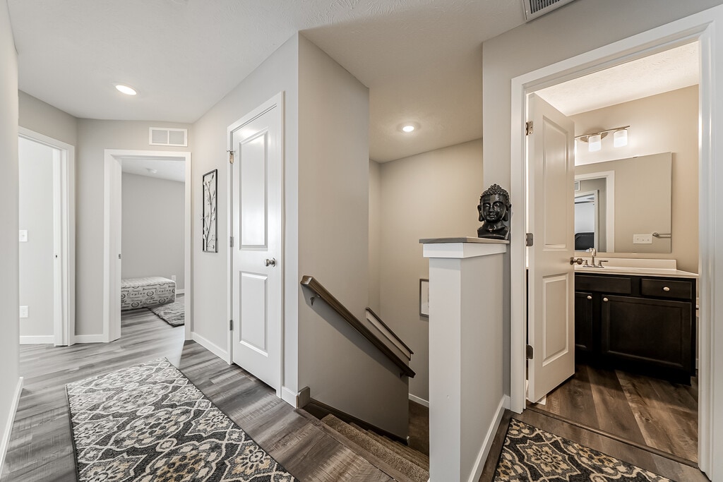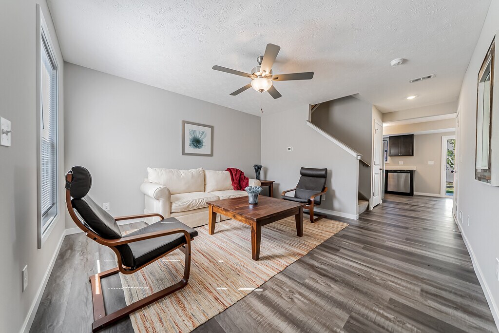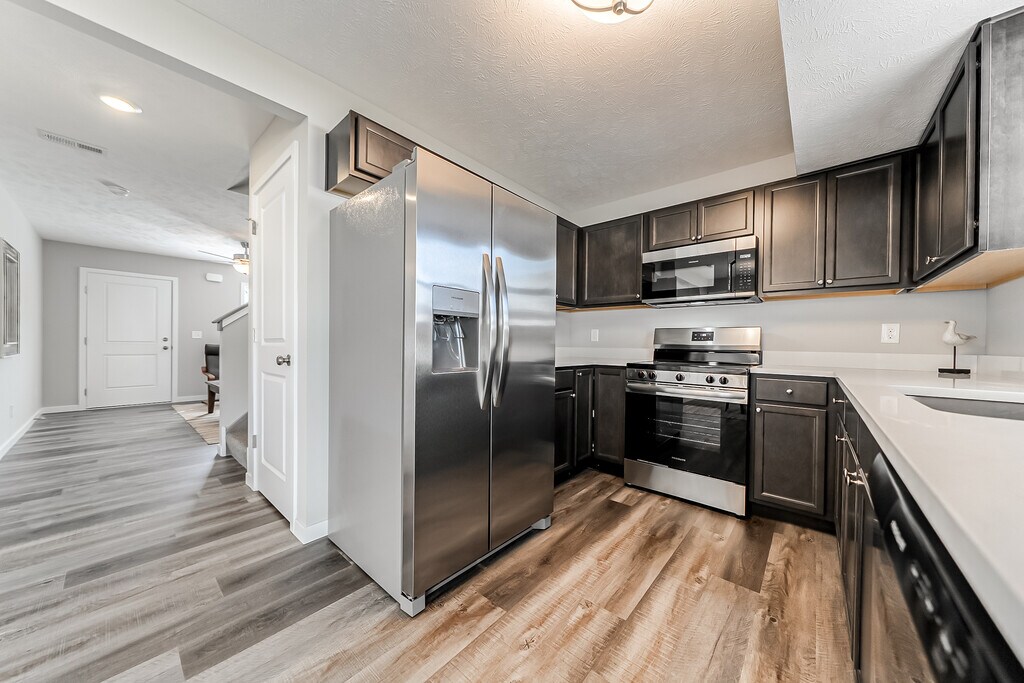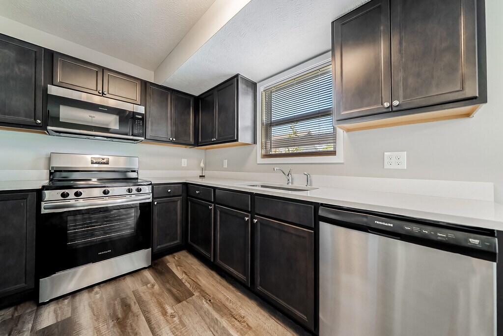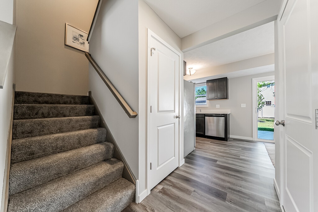 The 1200 square feet townhomes with attached garage are a must see! The first floor with its wood-like vinyl plank floors has the kitchen, dining space, laundry space, and living room. The kitchen comes with stainless steel appliances, many cabinets and a bunch of counter space. The Dining area looks out to a patio. The Living room is very spacious. Upstairs you will find 2 spare bedrooms with a hall bath. Then a Master Suite with a huge walk-in closet and a spacious Master Bath.