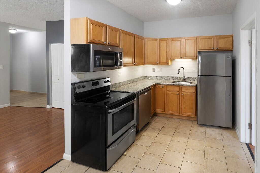 —Gold Maple Kitchen Cabinets —Granite Countertops with Deep Undermount Sink —Stainless Steel Appliances —Open Concept Living Room with BBQ Courtyard View —Two Renovated Bathrooms —Master Bedroom has En Suite Bathroom —Dark Plank Flooring with Stone Tile —Ceiling Fans with LED Lighting —Saflok Security Key Entry —Pets Welcome (No Pet Rent)