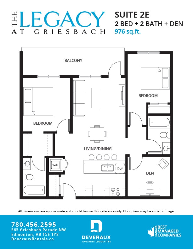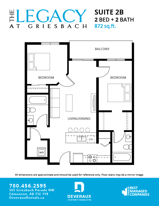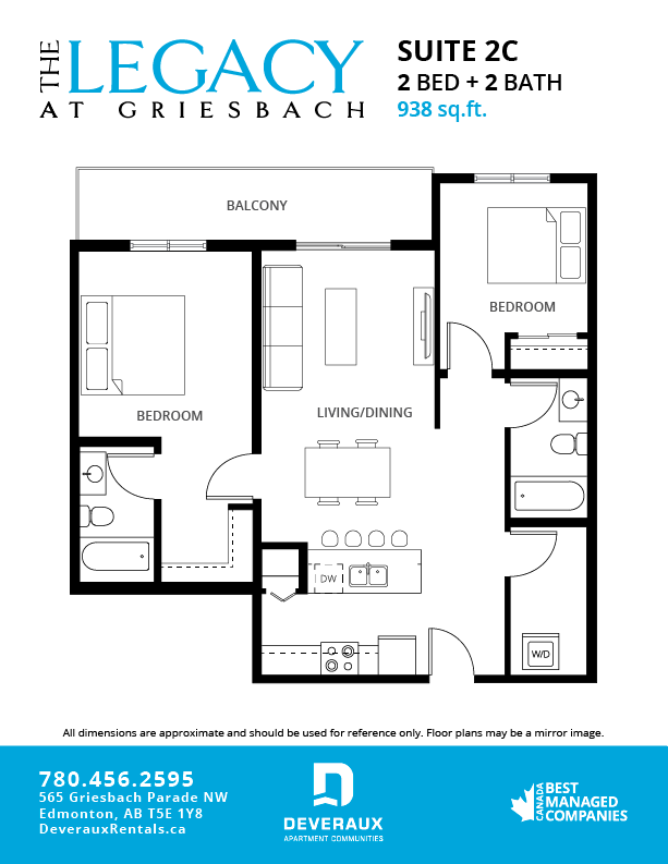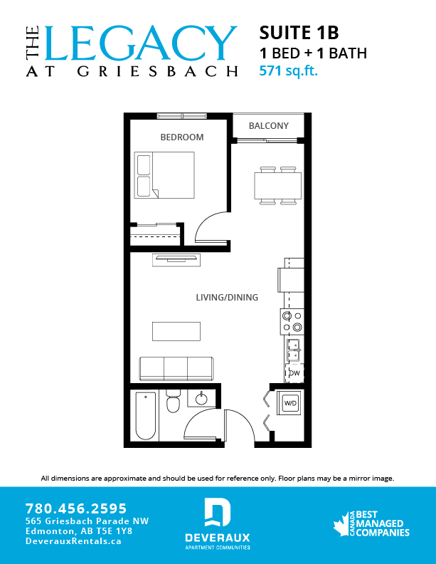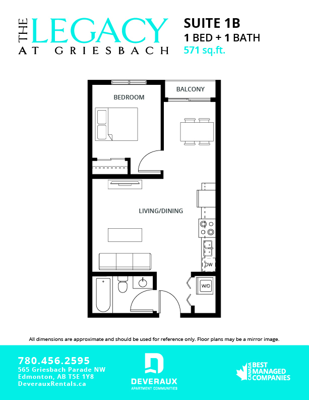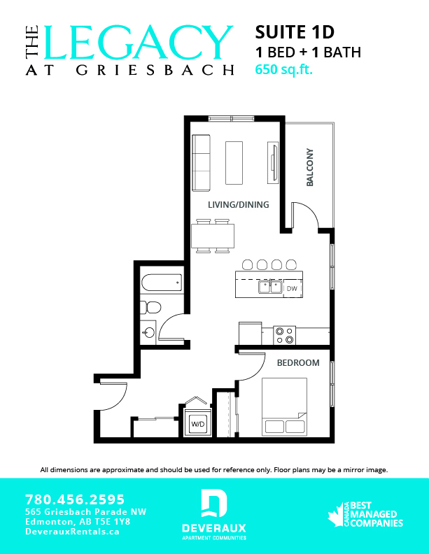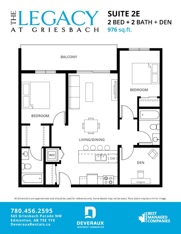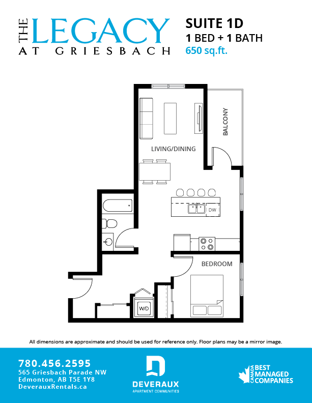 The Legacy at Griesbach is a pet-friendly, luxury apartment community in north Edmonton. Enjoy enviable on-site amenities, including a commercial-grade fitness centre and outdoor pool, and exclusive access to the on-site resident clubhouse, which has a games room, coworking space and community kitchen.Our one, two and three bedroom suites feature full-size stainless-steel appliances, in-suite laundry and contemporary finishes, such as luxury vinyl plank flooring, large windows, quartz countertops and high-gloss, soft-close cabinetry.Note: Select 1A & 1E suites, marked as CMHC, are designated as affordable housing. To qualify, household income may not exceed a specified threshold. Please reach out to our leasing team for more information.