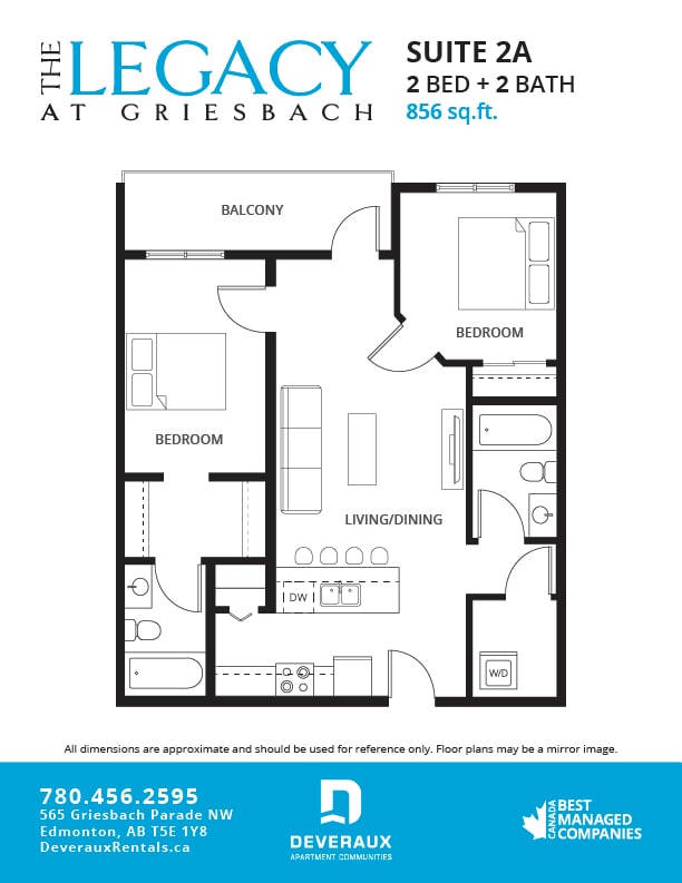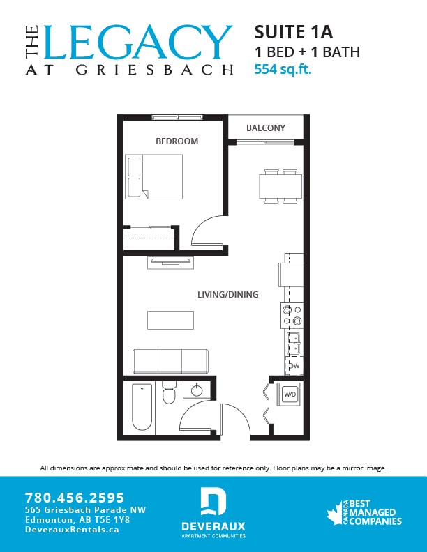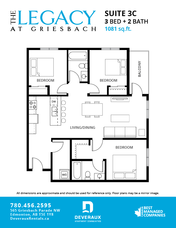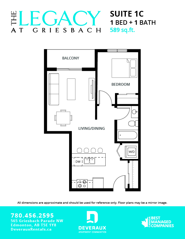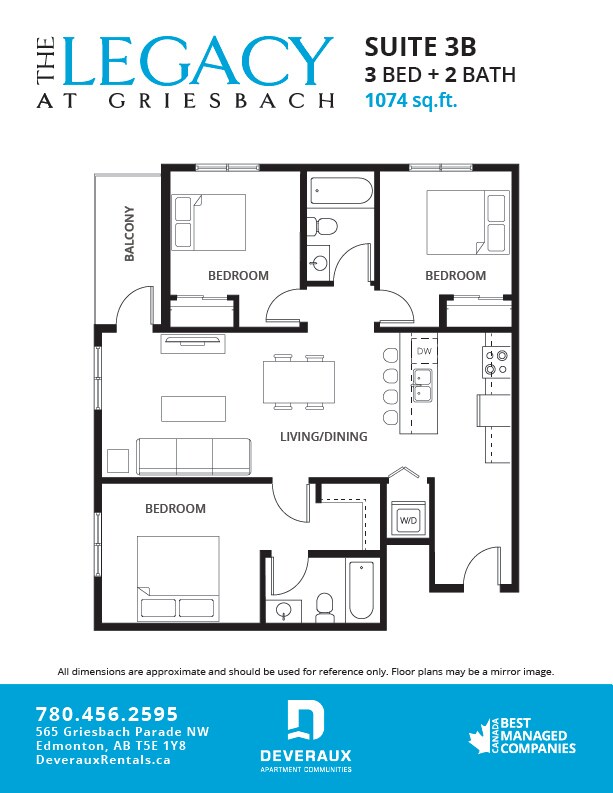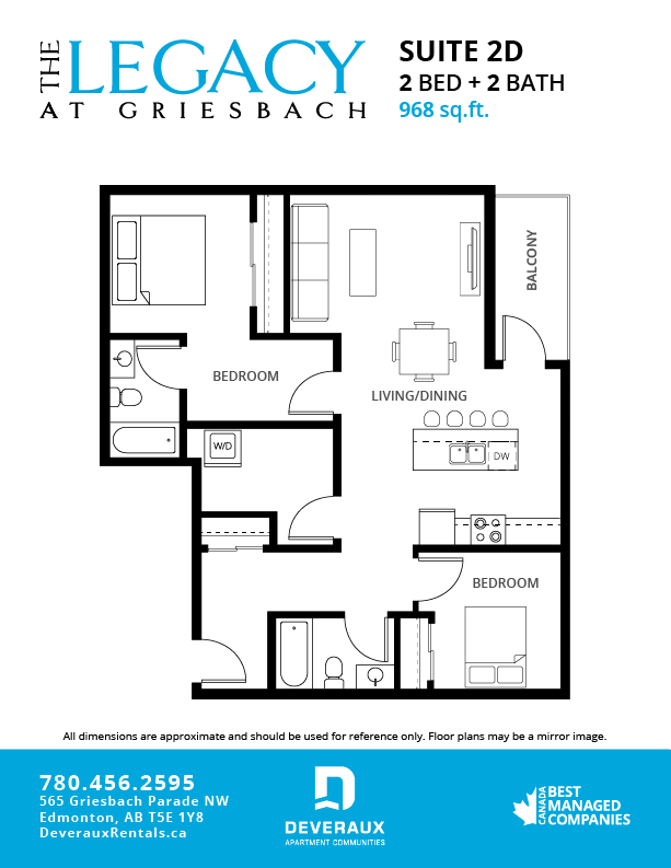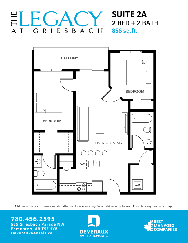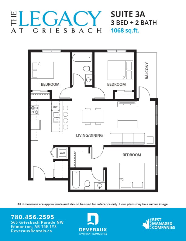 The Legacy at Griesbach is a pet-friendly, luxury apartment community in north Edmonton. Enjoy enviable on-site amenities, including a commercial-grade fitness centre and outdoor pool, and exclusive access to the on-site resident clubhouse, which has a games room, coworking space and community kitchen.Our one, two and three bedroom suites feature full-size stainless-steel appliances, in-suite laundry and contemporary finishes, such as luxury vinyl plank flooring, large windows, quartz countertops and high-gloss, soft-close cabinetry.Note: Select 1A & 1E suites, marked as CMHC, are designated as affordable housing. To qualify, household income may not exceed a specified threshold. Please reach out to our leasing team for more information.