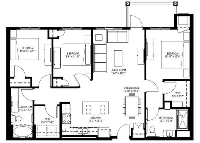 Three Bedroom B (Wheelchair Accessible) - Floorplan 1 Apartment Unit: 118Apartment Model: Three Bedroom B (Wheelchair Accessible)$1,9733 Bedroom, 2 Bath, 1320 sq ftAvailable Now