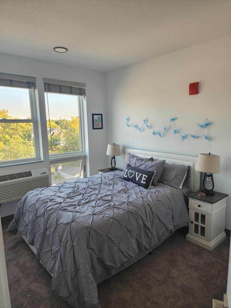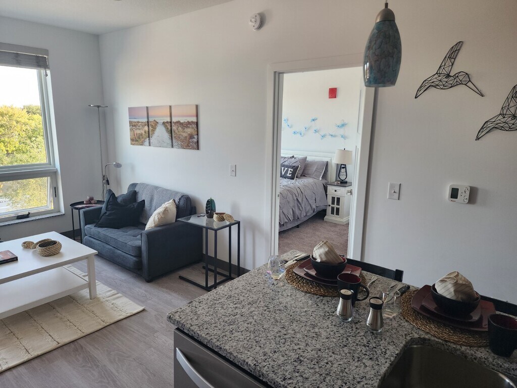 New Construction Apartments with a great view and patio. We also have heated parking along with an amazon drop box so no packages will be stolen. We pride ourselves on our customer service so please feel free to call anytime. We have 5 different layouts of 1 bedroom apartments with laundry in each of them. We are directly on the bus line so you can stay warm in the winter by watching for the bus in our lobby. We have trash chutes on each floor to save time from running out of the dumpster. The best part is free high-speed internet.