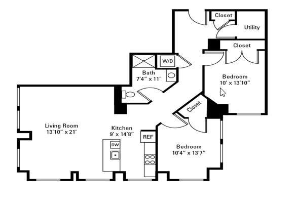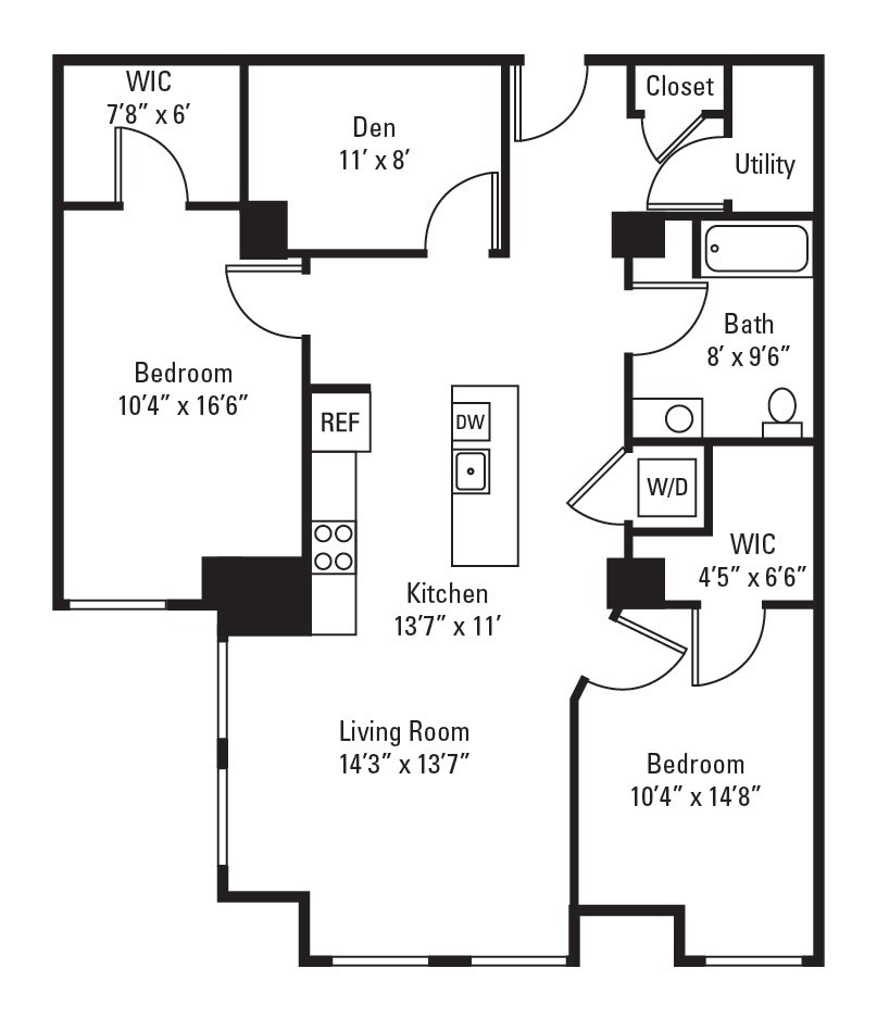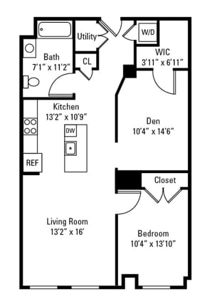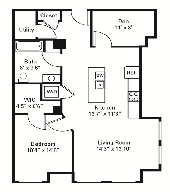 1 Bedroom 1 Bath w/ Den - Floorplan 1 Apartment Unit: 605Apartment Model: 1 Bedroom 1 Bath w/ Den$1,8751 Bedroom, 1 Bath, 925 sq ftAvailable Now1 Bedroom 1 Bath w/ Den