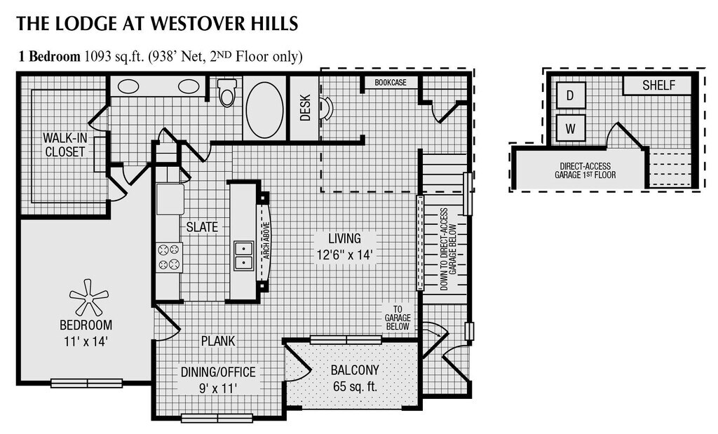 1 Bed 1 Bath 1093 SqFt (938 Net) - Floorplan 2 ![]()