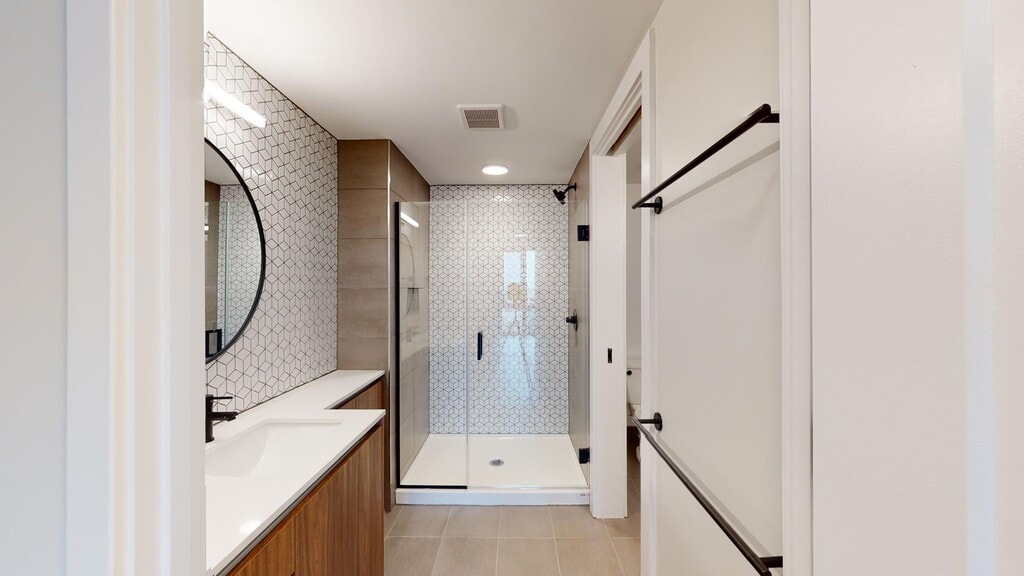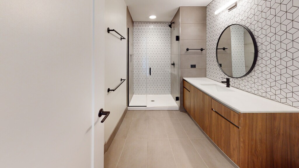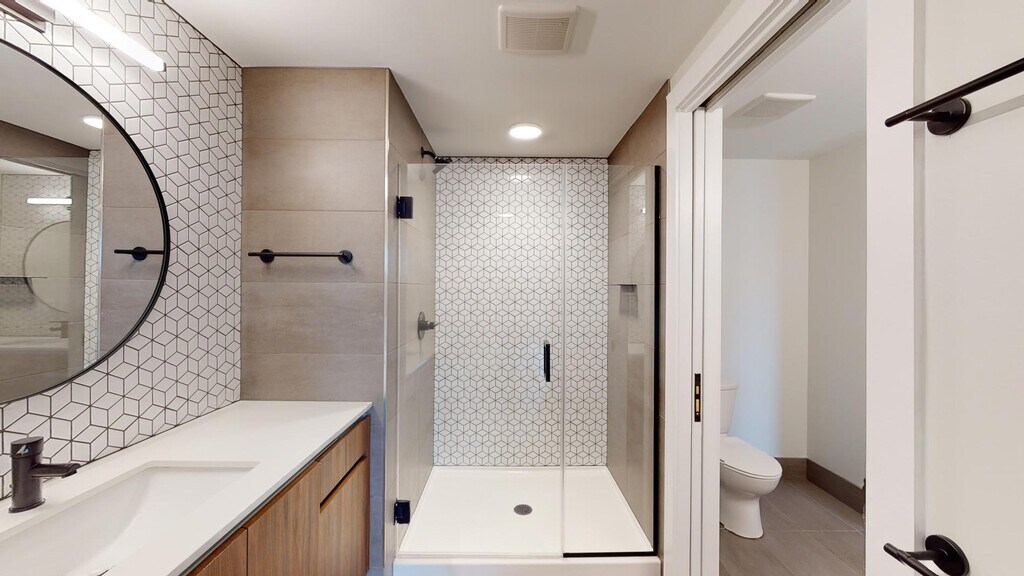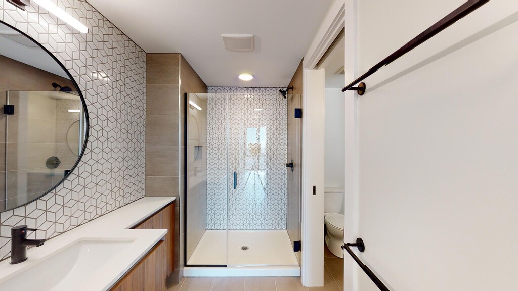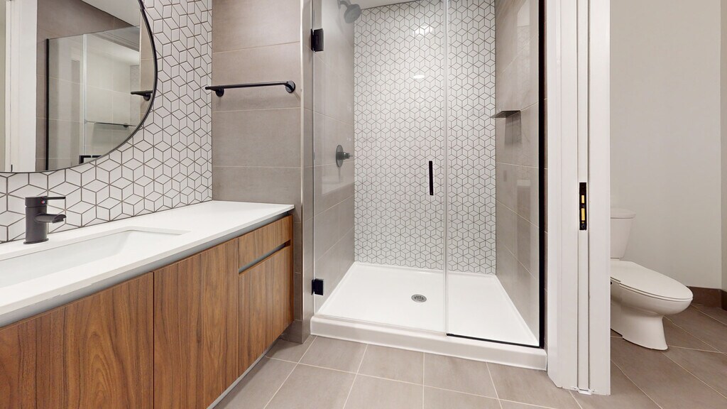 - Frameless glass enclosed shower