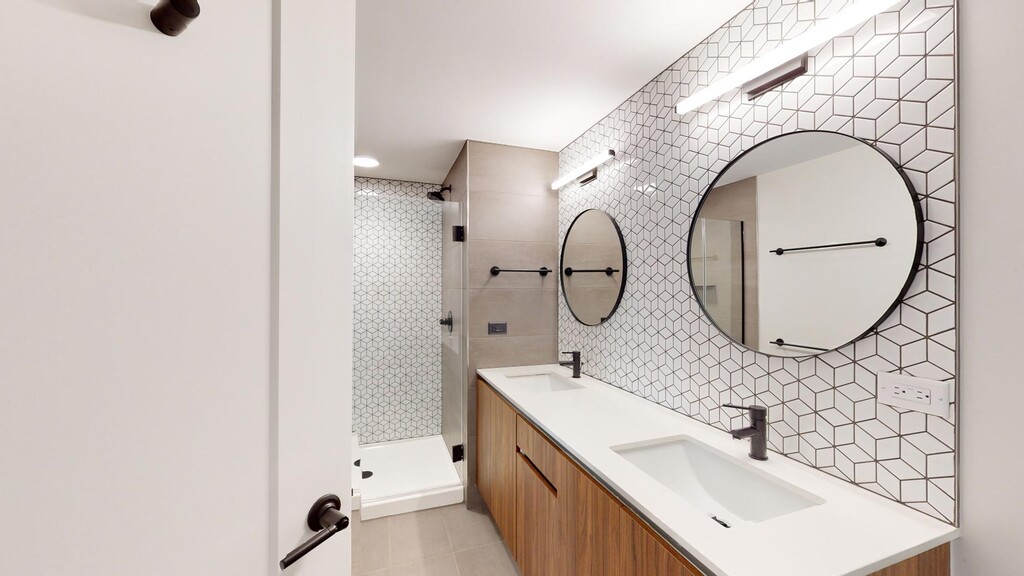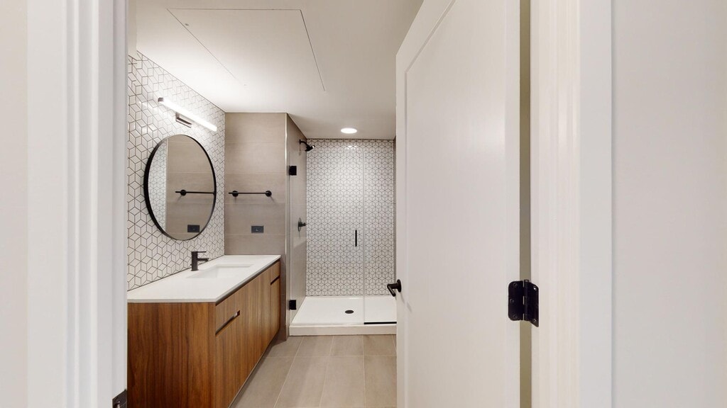 - Floor-to-ceiling tiled shower