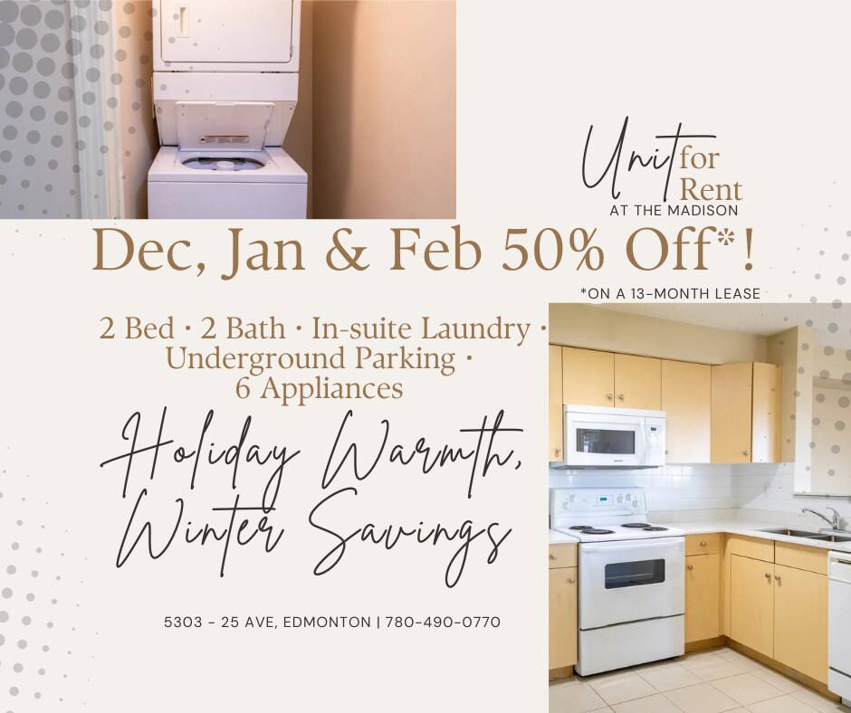 Experience comfortable and stylish living at The Madison, a modern mid-rise apartment community in south Edmonton. All suites feature impressive finishings, including patios or balconies, six appliances (fridge, stove, dishwasher, microwave, washer, and dryer), in-suite laundry, window coverings, and electric fireplaces, providing both convenience and comfort. The property offers secure underground parking, surface parking, storage lockers, bicycle racks, keyless entry, video surveillance, and beautifully landscaped outdoor spaces for residents to enjoy. Located in the heart of Mill Woods, The Madison provides easy access to Mill Woods Town Centre, Mill Woods LRT Station, Mill Woods Public Library, Mill Woods Recreation Centre, Grey Nuns Community Hospital, bus stops, restaurants, banks, and schools, making it ideal for families, professionals, and students alike. Images shown are for advertisement purposes only and may not reflect the exact unit layout. Rent listed applies when signing a 12-month lease.
