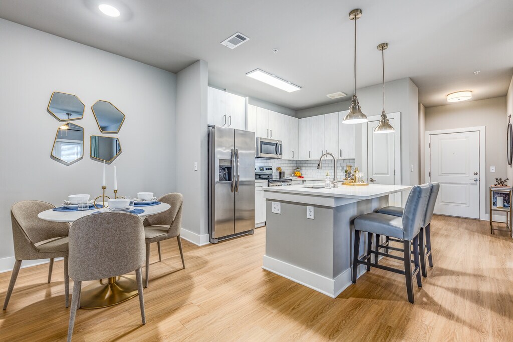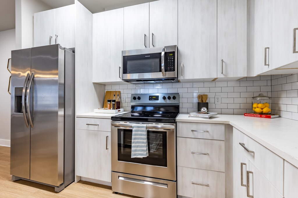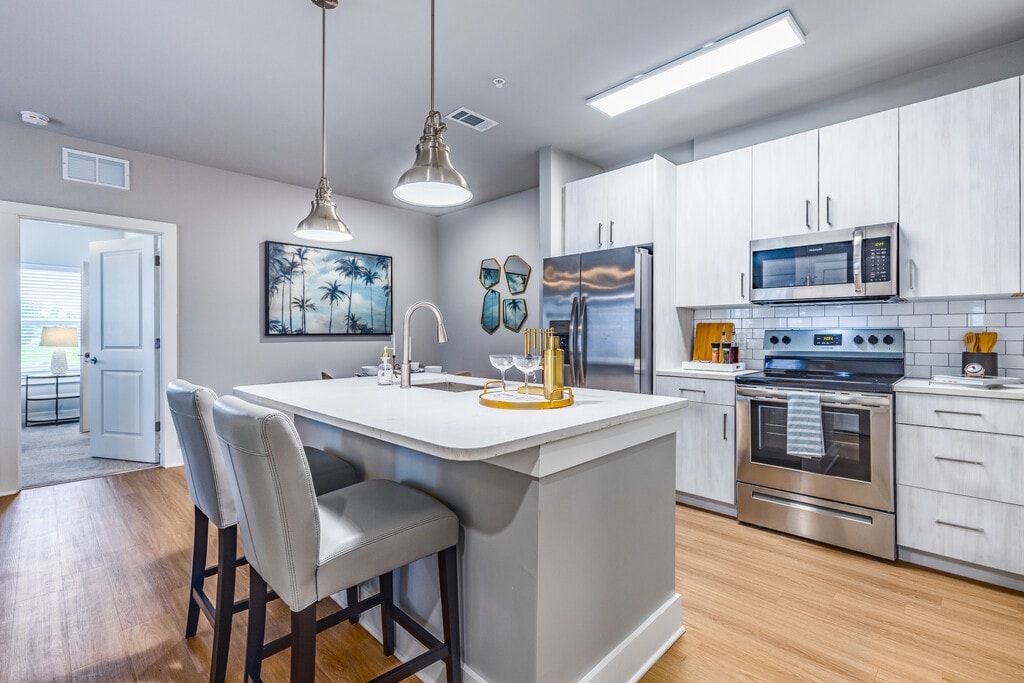 Welcome to The Mark at Wildwood Apartments, brand new luxury apartments for rent in Oxford, Florida! If you are searching for an upscale one, two, or three bedroom apartment, The Mark at Wildwood Apartments has what you're looking for. The gourmet kitchen features stainless steel appliances, quartz countertops, a subway tile backsplash, as well as luxury wood cabinets with soft-close drawers, and is combined with an open, spacious design to make your new home a place to both relax and entertain. Every floorplan also features wood-style plank flooring, an in-home washer/dryer, private balcony, interior glass barn doors, USB charging ports, and smart thermostats!