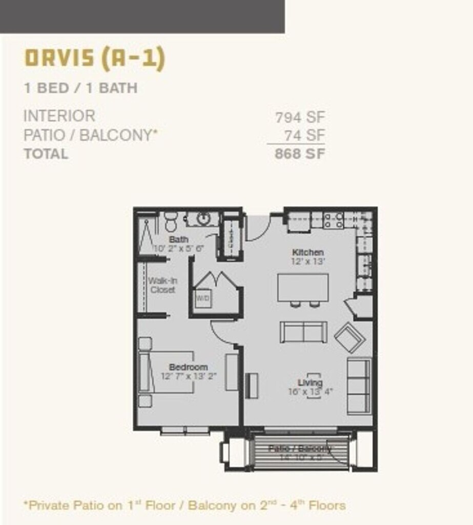 Apartment Model: Orvis (4th Floor)$1,7501 Bedroom, 1 Bath, 794 sq ftAvailable January 10, 2026FloorplansPhotos![]()