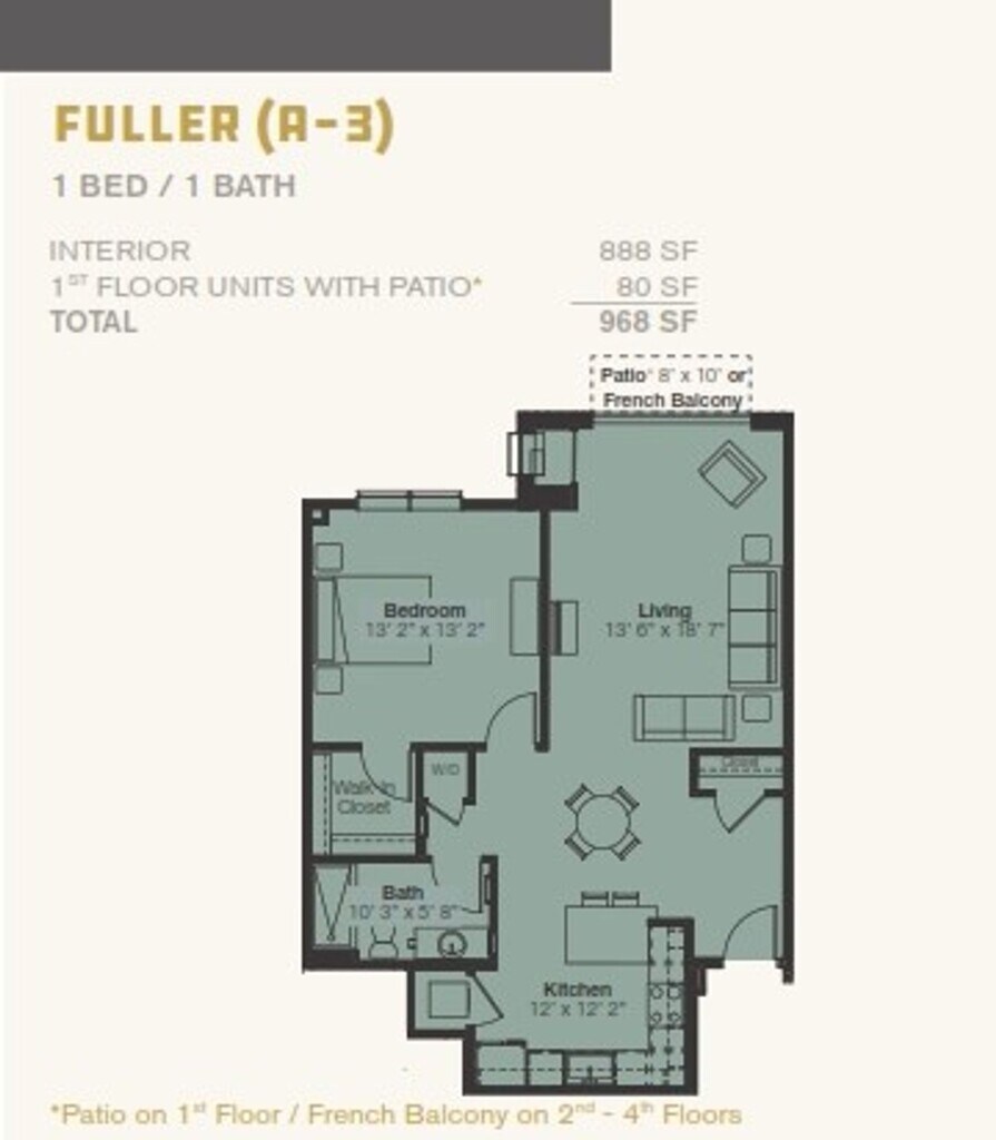 Fuller (1st Floor) - Floorplan 2 Apartment Unit: 126Apartment Model: Fuller (1st Floor)$1,7951 Bedroom, 1 Bath, 888 sq ftAvailable NowMead (1st Floor)