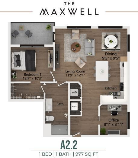 Apartment Model: A2.2From $1,9101 Bedroom, 1 Bath, 977 sq ftAvailable Now![]()