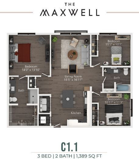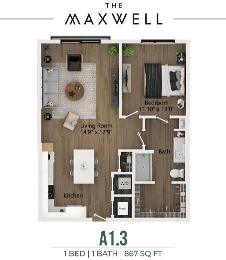 Apartment Model: A1.3$1,9151 Bedroom, 1 Bath, 867 sq ftAvailable Now![]()
