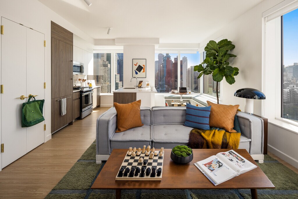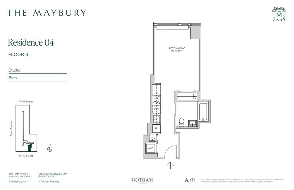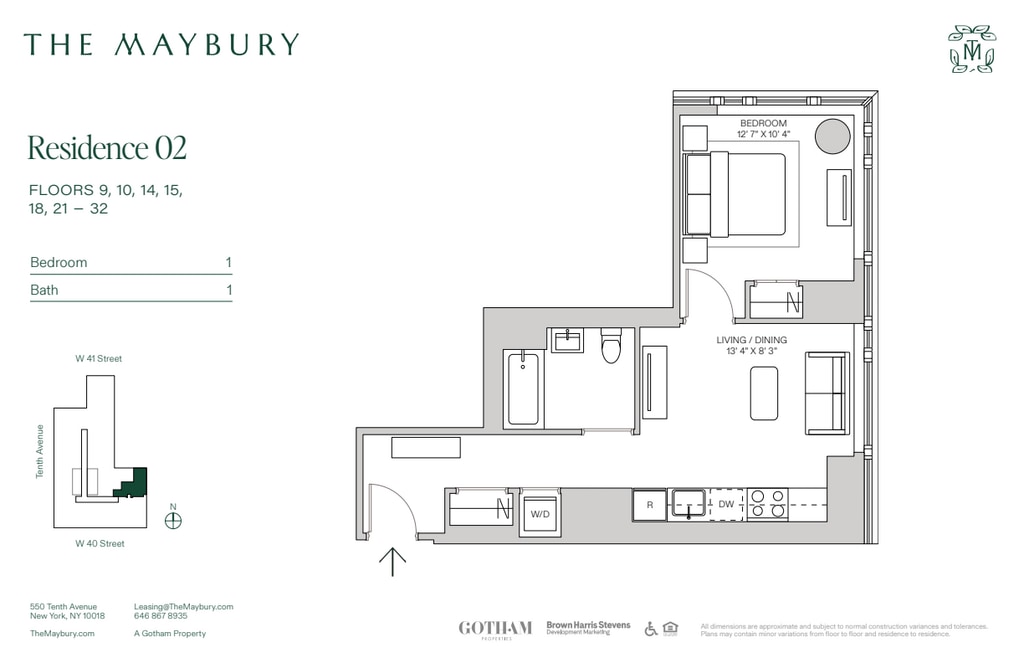 Now leasing in Hudson Yards, The Maybury offers studio to two-bedroom luxury rental residences for the sophisticated urbanite. Live in full bloom through a host of amenities and lifestyle services. The Maybury offers over 20,000 square feet of inspired indoor and outdoor amenities paired with incomparable lifestyle services by Gotham Living. Enjoy access to a rooftop terrace with stunning Manhattan views, an upscale sky lounge, collaborative co-working spaces, and a state-of-the-art fitness club. The Gotham Living dedicated concierge team complements the amenity suite by offering a selection of unique events and programming, enabling residents to cultivate a rich lifestyle. The sophisticated and meticulously designed residences boast expansive windows that frame dramatic skyline views. Abode by Gotham studios are equipped with multifunctional and transforming furniture. From its prime location in Hudson Yards, The Maybury’s is within minutes of the lush 11-mile Hudson River Greenway, the iconic High Line and vibrant Hell’s Kitchen. Building Amenities: - 24-hour Attended Lobby - Gotham Living: Dedicated Concierge, Lifestyle Services, Curated Events & Exclusive – GothamCard Benefits - 46th Floor Rooftop Sky Lounge with Wet Bar - 46th Floor Sundeck with Landscaped Lounge Area & Outdoor Shower - 8th Floor Outdoor Terrace with BBQs, Landscaped Seating Areas, & Outdoor TV - 8th Floor Resident Lounge & Co-working Space with Conference Rooms, Phone Booth, & Work from Home Pods - State-of-the-art Fitness Club with Yoga Studio & Outdoor Terrace - 4th Floor Resident Lounge & Co-working Space - Package Room with Cold Storage - Resident & Bicycle Storage - Common Laundry Room - Pet Spa Residence Features: - Panoramic City & Hudson River Views* - Expansive Windows - Complimentary Window Treatments - Central AC & Heat - In-Residence Washer & Dryer* - Panelized Appliance Suite - Luxury Plank Flooring - Smart Entry Lock - Ceiling Heights up to 10’ - Abode by Gotham Residences with Custom Murphy Beds by Resource Furniture