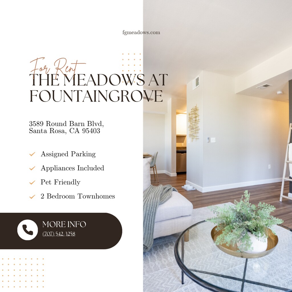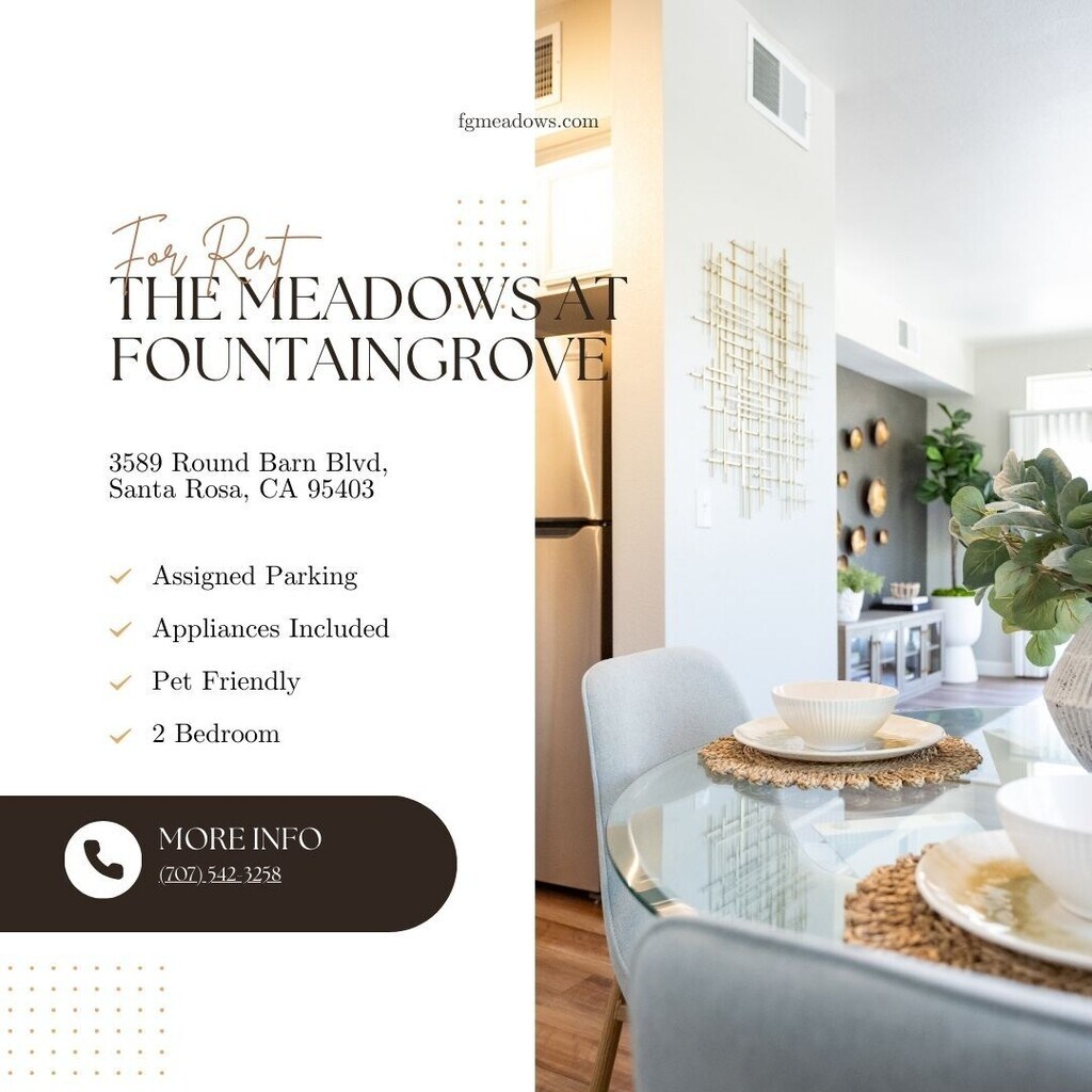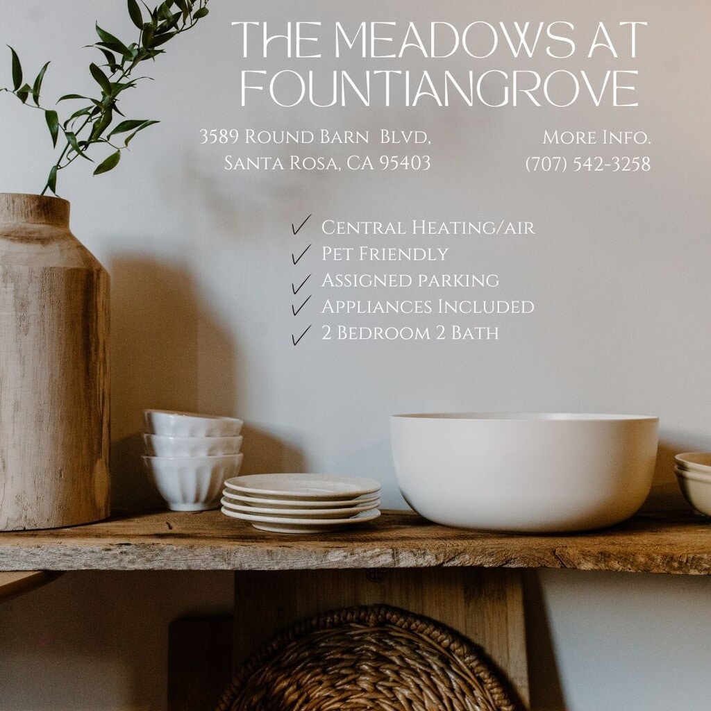 Experience elevated, boutique-inspired living in the heart of Fountaingrove. Whether you’re seeking an airy one-bedroom retreat or a sophisticated two-bedroom residence, each home is thoughtfully designed to reflect your lifestyle. Enjoy designer finishes, modern comforts, and breathtaking panoramic views that set The Meadows apart. Apartment Features : Stylish, durable vinyl flooring Sleek white cabinetry with modern hardware Granite slab countertops Full-size washer & dryer Central heating and air conditioning Convenient USB charging ports Private covered outdoor terrace Community Amenities: Sparkling solar-heated swimming pool Cardio wellness studio Elegant resident social lounge Serene nature trails and green spaces Complimentary Wi-Fi in amenity spaces Easy access to Hwy. 101 100% smoke-free community Additional Perks : Flexible lease terms to fit your lifestyle Pet-friendly community Explore more: Call us at to schedule your tour! Office Hours Monday–Friday: 8:30 am – 5:30 pm Apply Online 24/7!