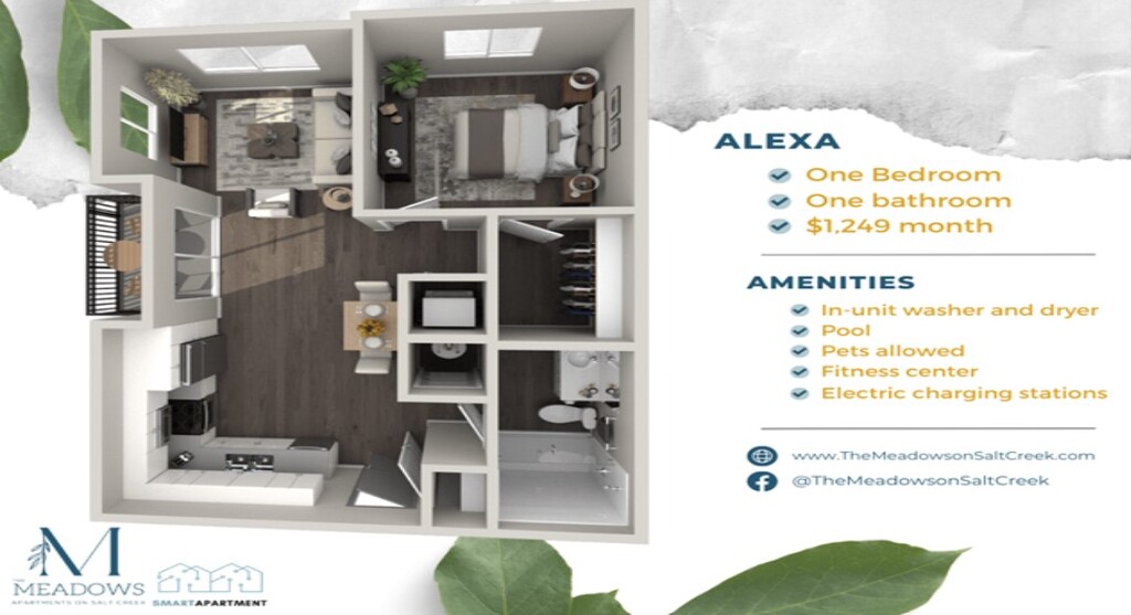The Meadows on Salt Creek offers Studio to 3 Bedroom apartments starting from $1,029 and having 546–1,195 sq ft. Here is the current pricing and availability: