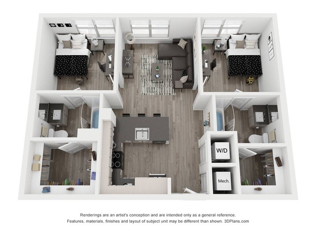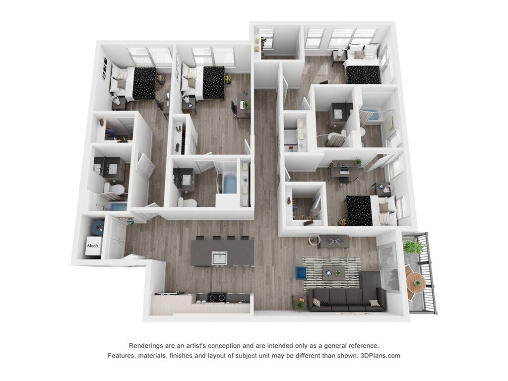 C1 - 3x3 - Floorplan 1 Apartment Unit: Private BedroomApartment Model: C1 - 3x3$1,0453 Bedroom, 3 Bath, 1275 sq ftAvailable August 13, 20264 Bedrooms