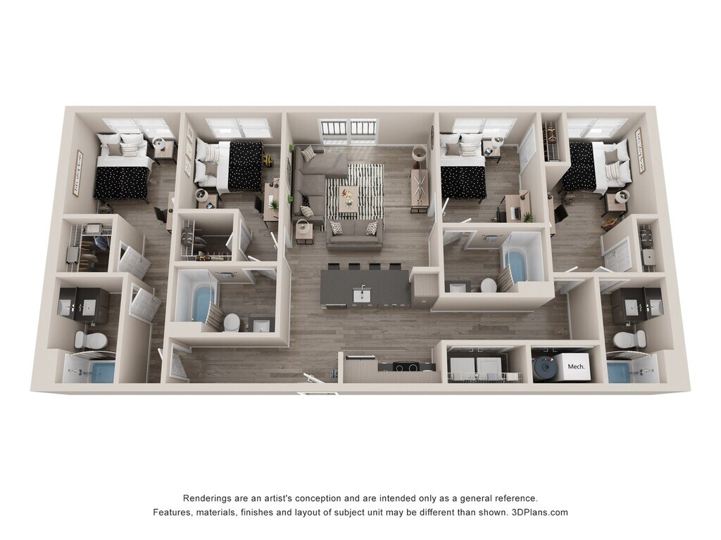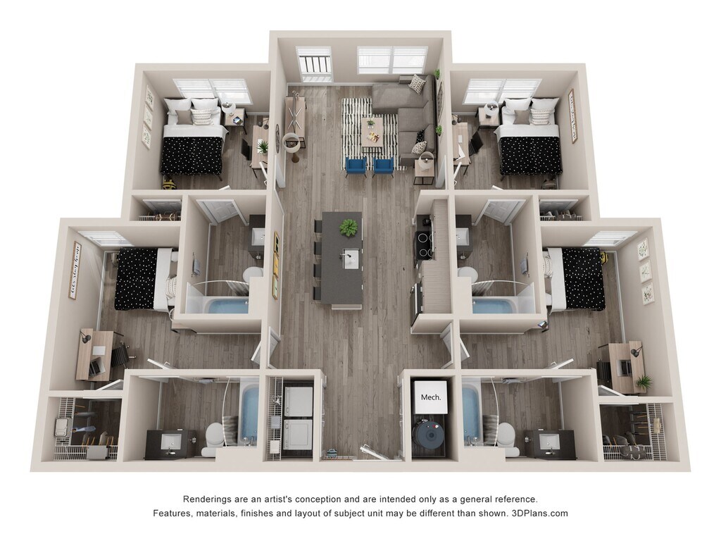 D1 - 4x4 - Floorplan 1 Apartment Unit: PrivateApartment Model: D1 - 4x4$9504 Bedroom, 4 Bath, 1326 sq ftAvailable NowApartment Unit: PrivateApartment Model: D1 - 4x4$9504 Bedroom, 4 Bath, 1326 sq ftAvailable August 16, 2026D4 - 4x4
