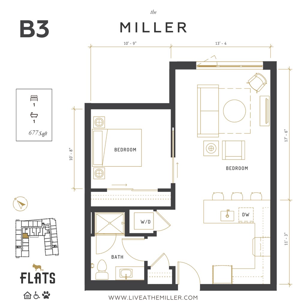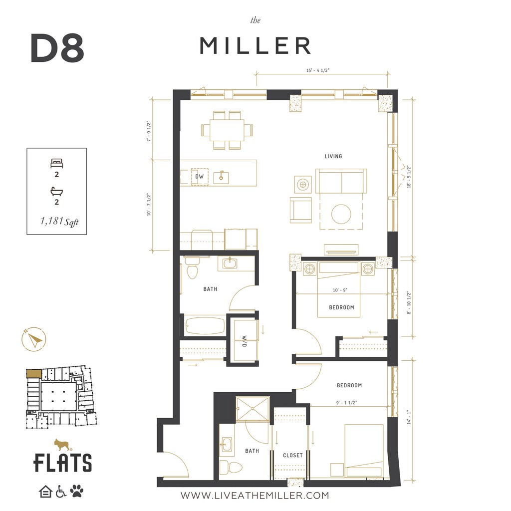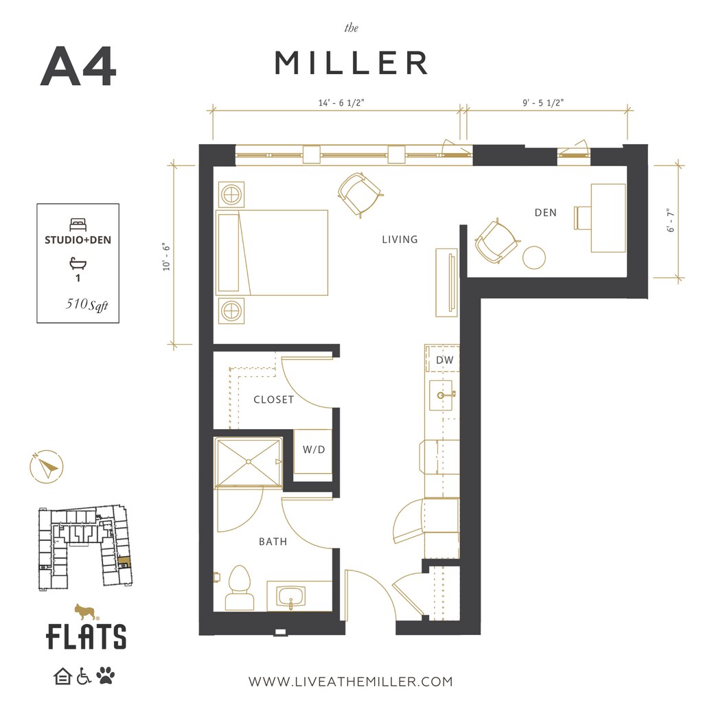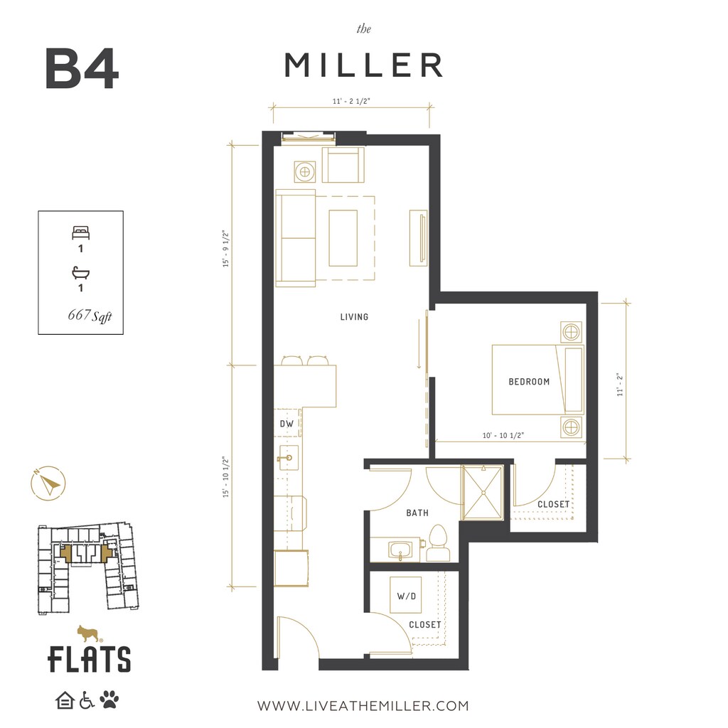 The Miller offers Studio to 2 Bedroom apartments starting from $1,615 and having 431–1,181 sq ft. Here is the current pricing and availability: