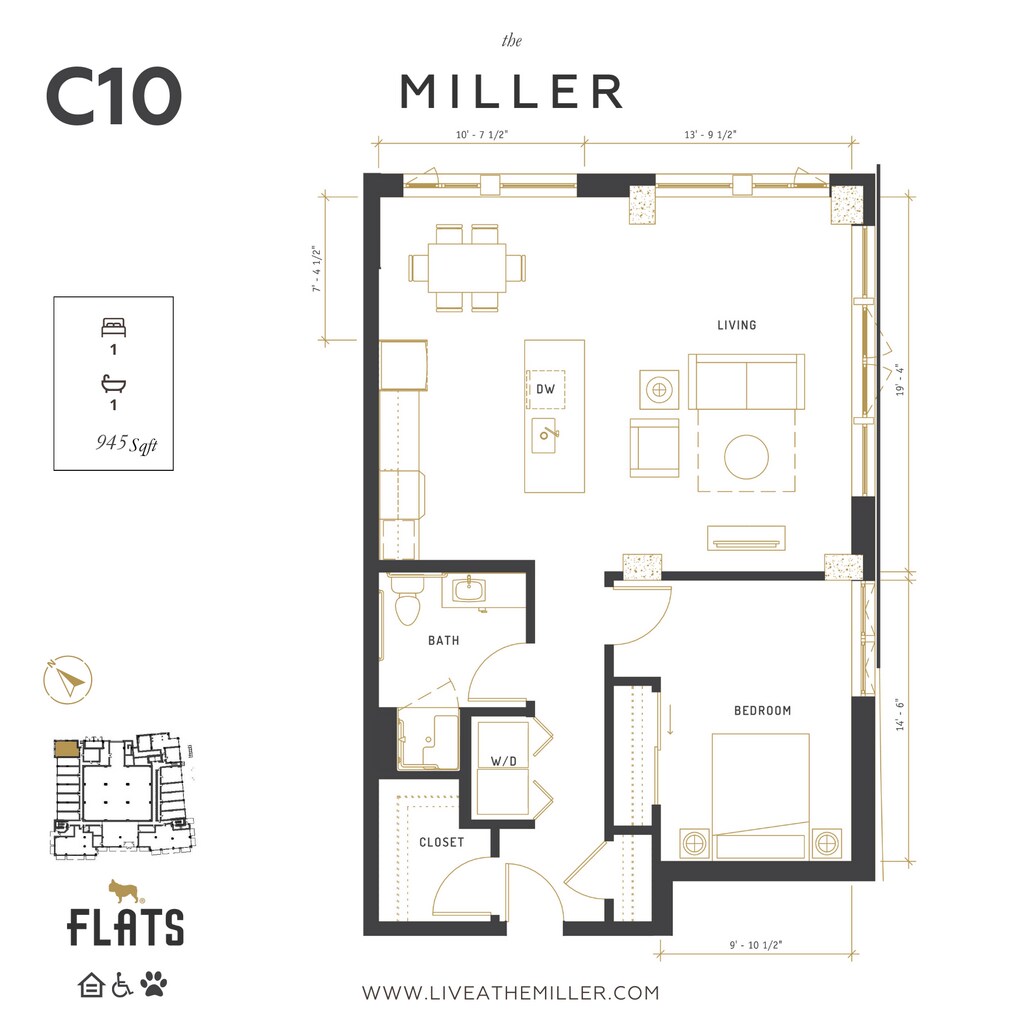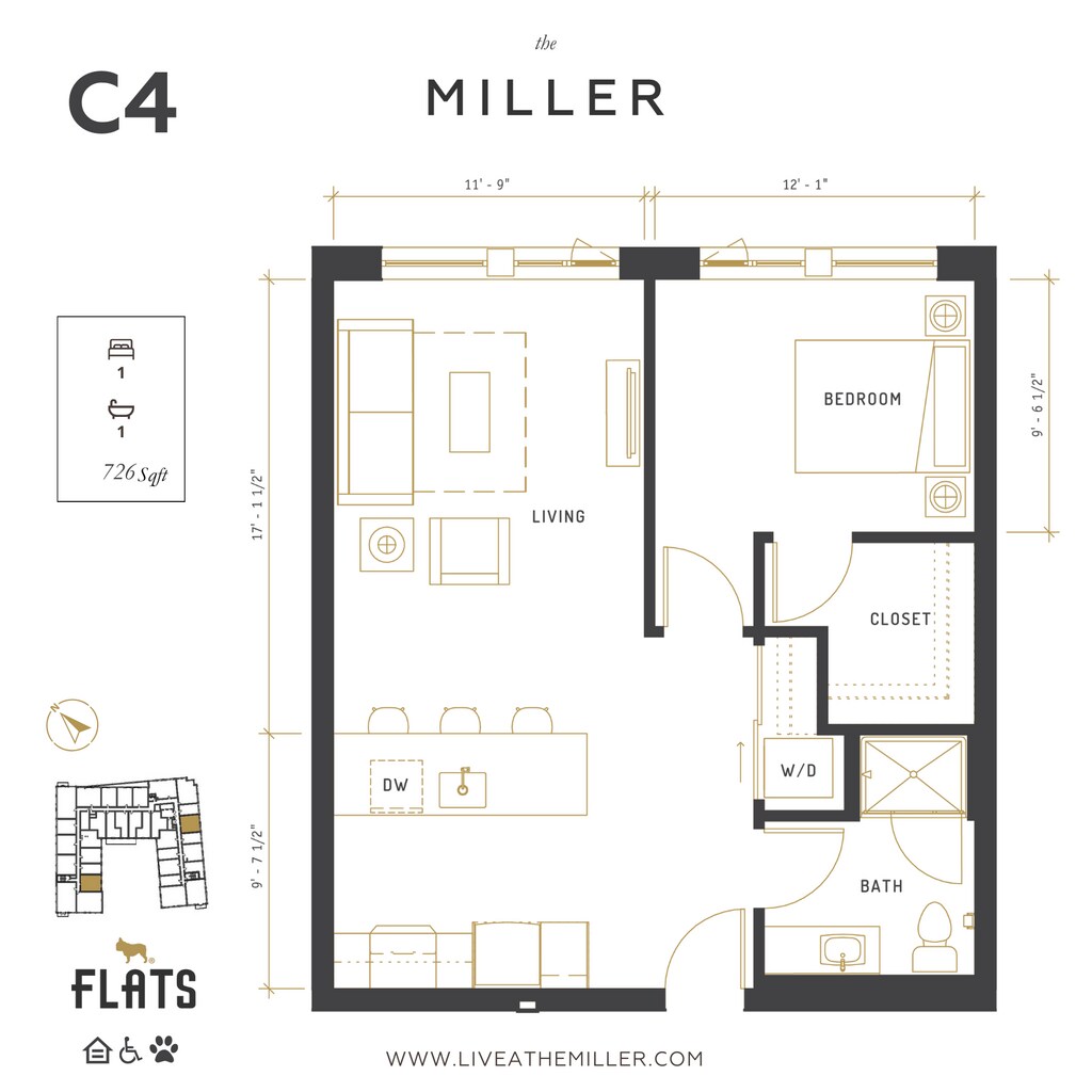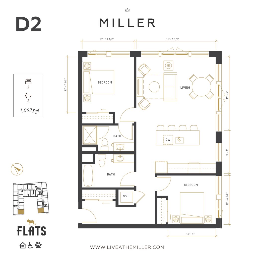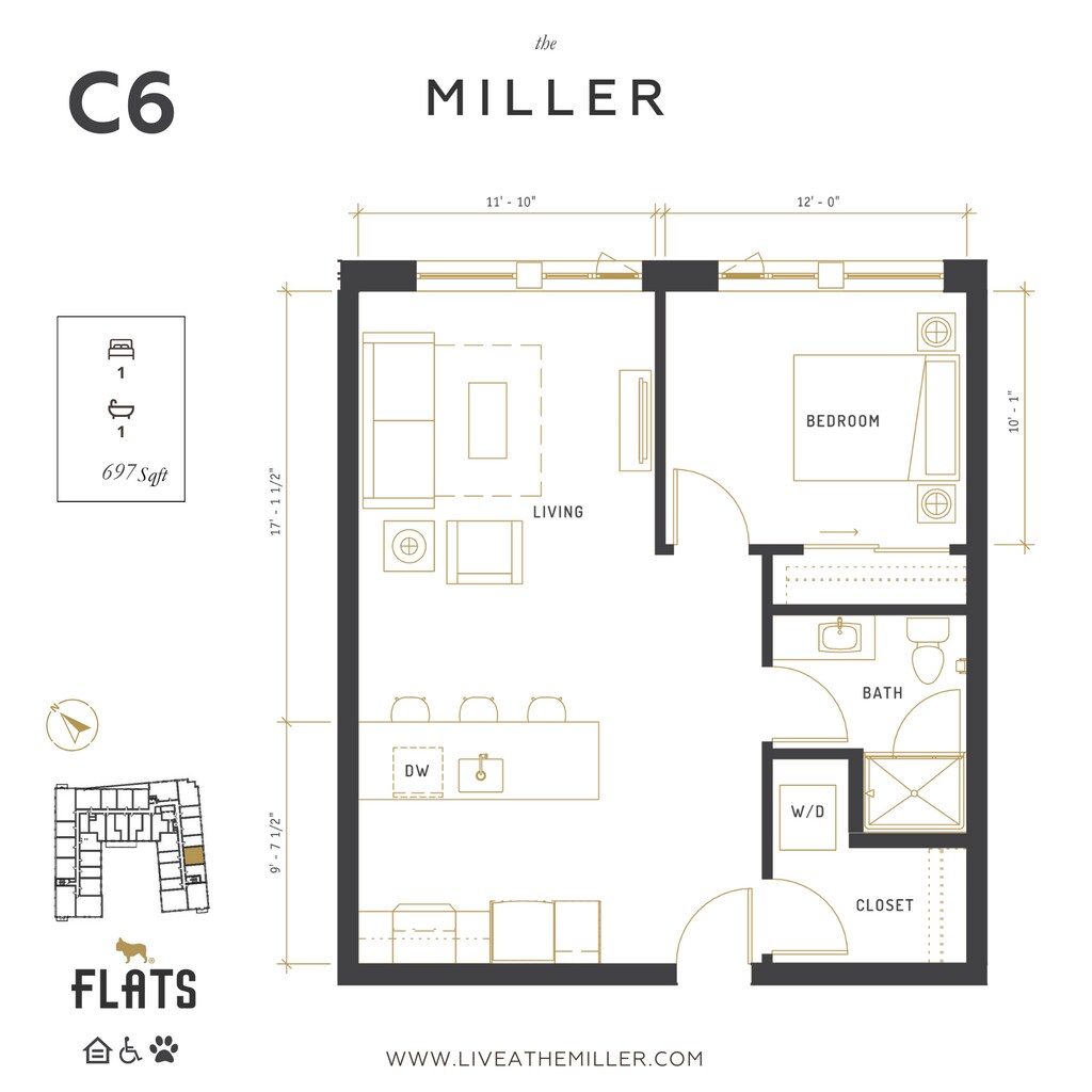 The Miller offers Studio to 2 Bedroom apartments starting from $1,615 and having 431–1,181 sq ft. Here is the current pricing and availability: