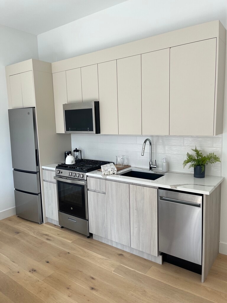 This brand new construction building consists of 25 units; offering 1, 2, and 3 bedroom floor plans. Each unit has an open floor plan with hardwood floors, in-unit laundry, windows that provide an open-air environment and central air and heat. The building offers both outdoor private and communal spaces. Our building is pet-friendly. Garage and outdoor parking are available. Our building offers stunning skyline views from our private rooftop deck with tenant only access! Keep your car protected from the Chicago weather in our indoor parking garage. And the ground floor bike storage makes it easy to bring your bike in and out of the building. When you live in Uptown, you have easy access to the CTA red line, city buses and Lake Shore Drive. Parks nearby include the lakefront with trails, Clarendon Park Community Center and Montrose Beach.