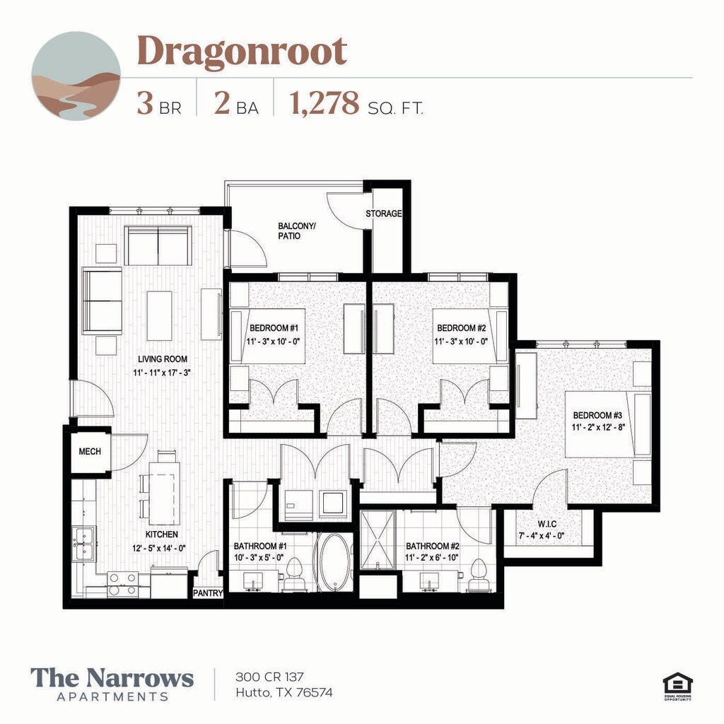 Dragonroot - Floorplan 1 Apartment Unit: 13207Apartment Model: Dragonroot$1,7543 Bedroom, 2 Bath, 1278 sq ftAvailable NowButtonwood
