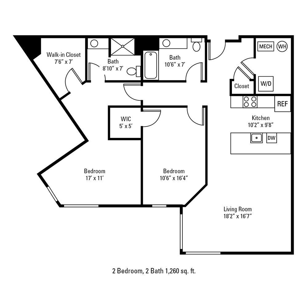 2 Beds, 2 Baths, 1260 sq ftAvailable NowLargest 2 BedroomThis is the largest 2 Bedroom at this PropertyModel Gallery