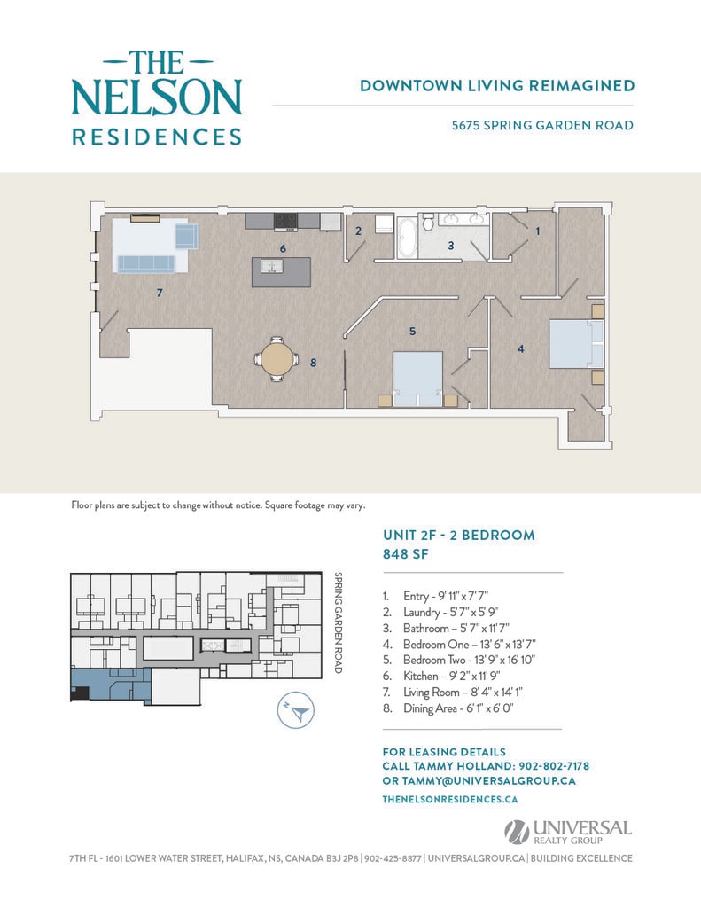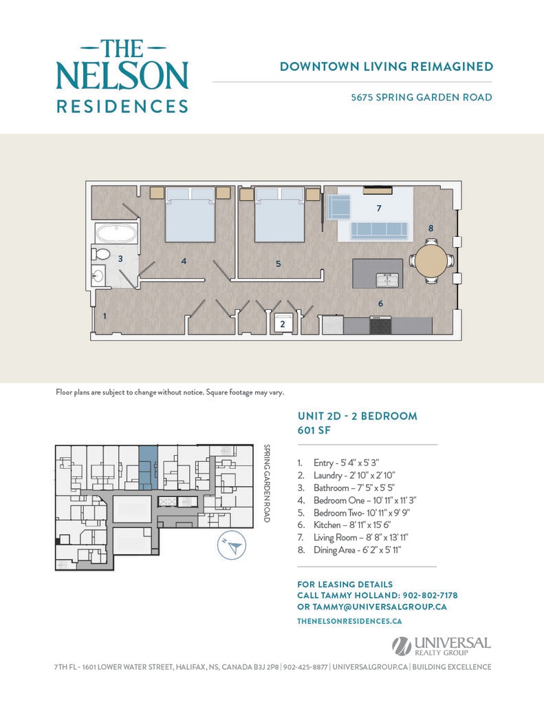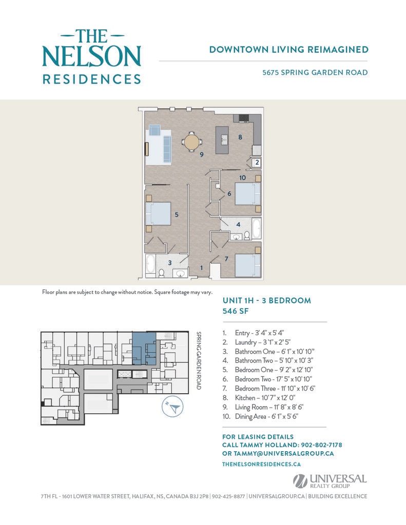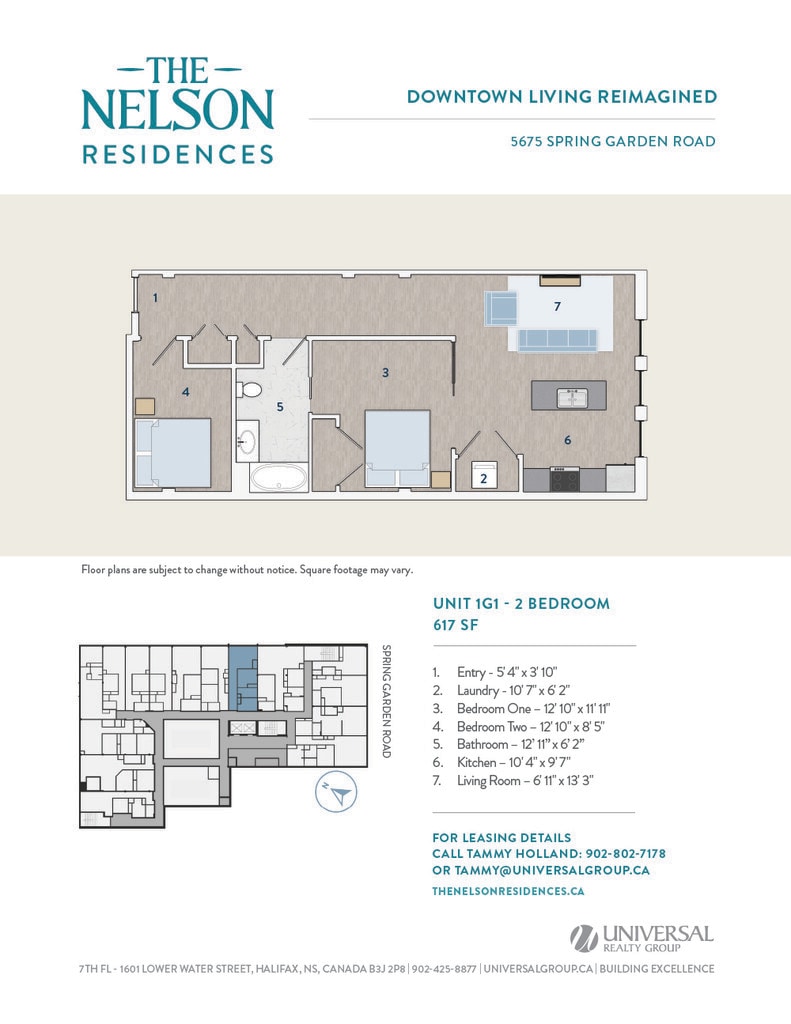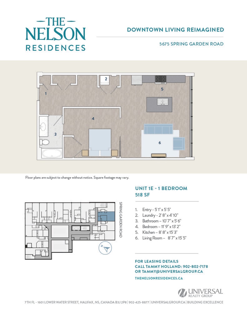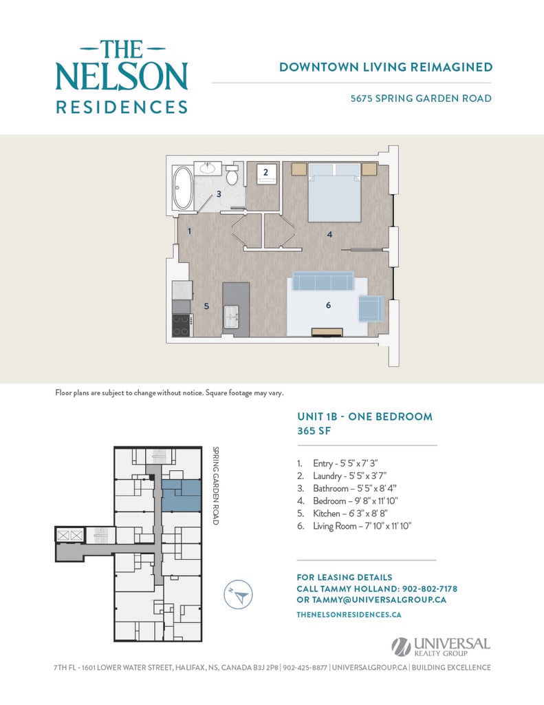 Universal Realty Group is pleased to introduce The Nelson Residences — a distinguished downtown address transformed into stylish and contemporary apartments designed for urban living. In collaboration with the visionary architects at Studioworks, the project redefines the corner of Spring Garden Road and South Park Street, creating a refined, connected living experience at the heart of the city. Opening April 2026, The Nelson Residences offer a fresh perspective on modern city life. Boasting a premier downtown location, The Nelson Residences feature 78 thoughtfully designed apartments, from studios to three-bedroom layouts, with open floor plans and modern kitchens equipped with stainless steel appliances and luxurious finishes. Residents enjoy a curated suite of amenities, including an elegant Club Room, a state-of-the-art Fitness Room, and access to premium services from the adjacent Lord Nelson Hotel & Suites. Covered parking provides added convenience, with direct access to the shops, dining, and services of Park Lane Mall.