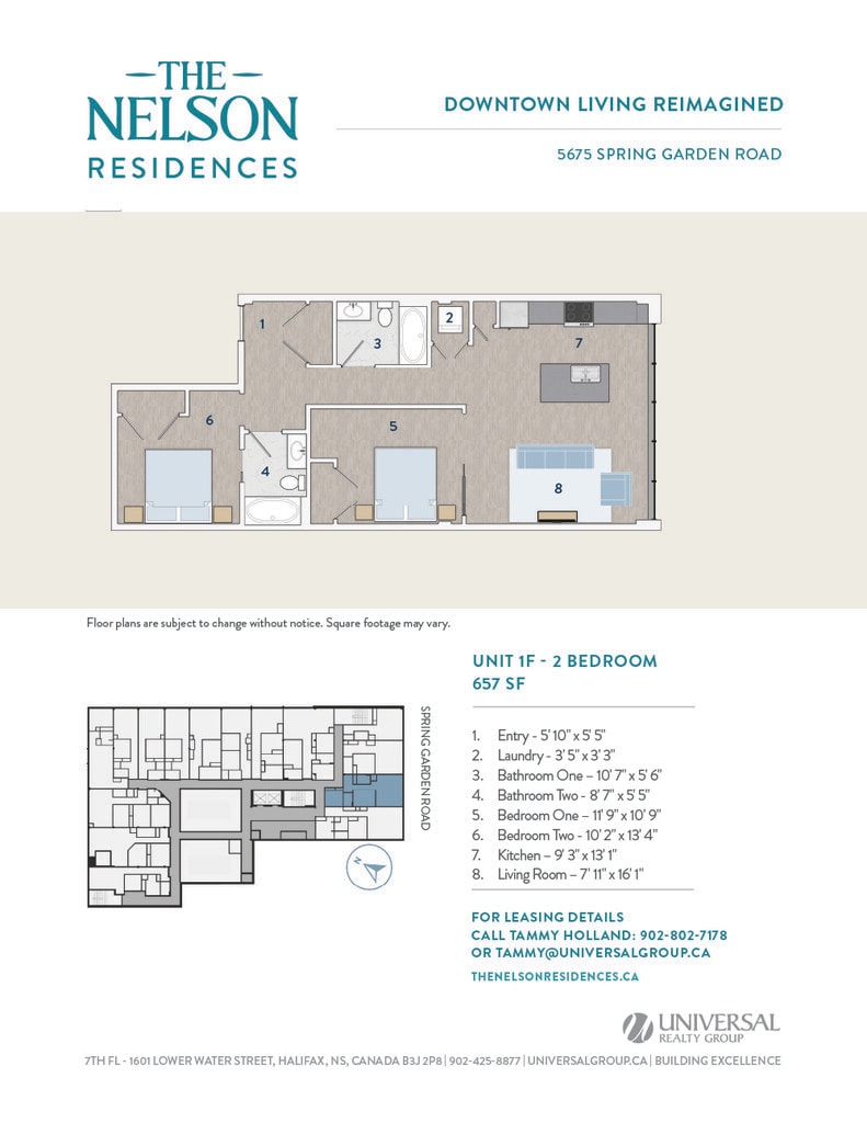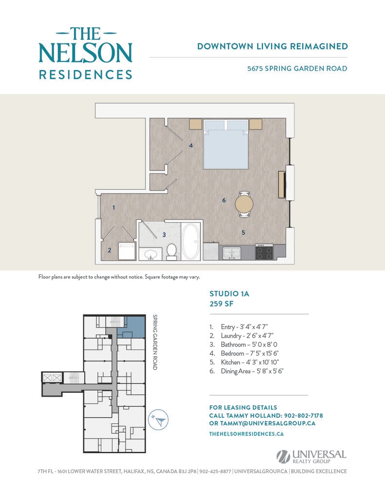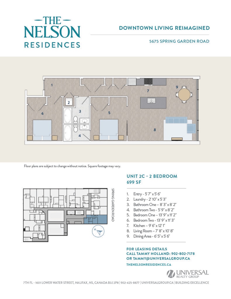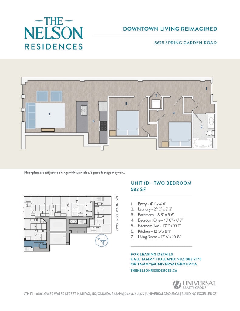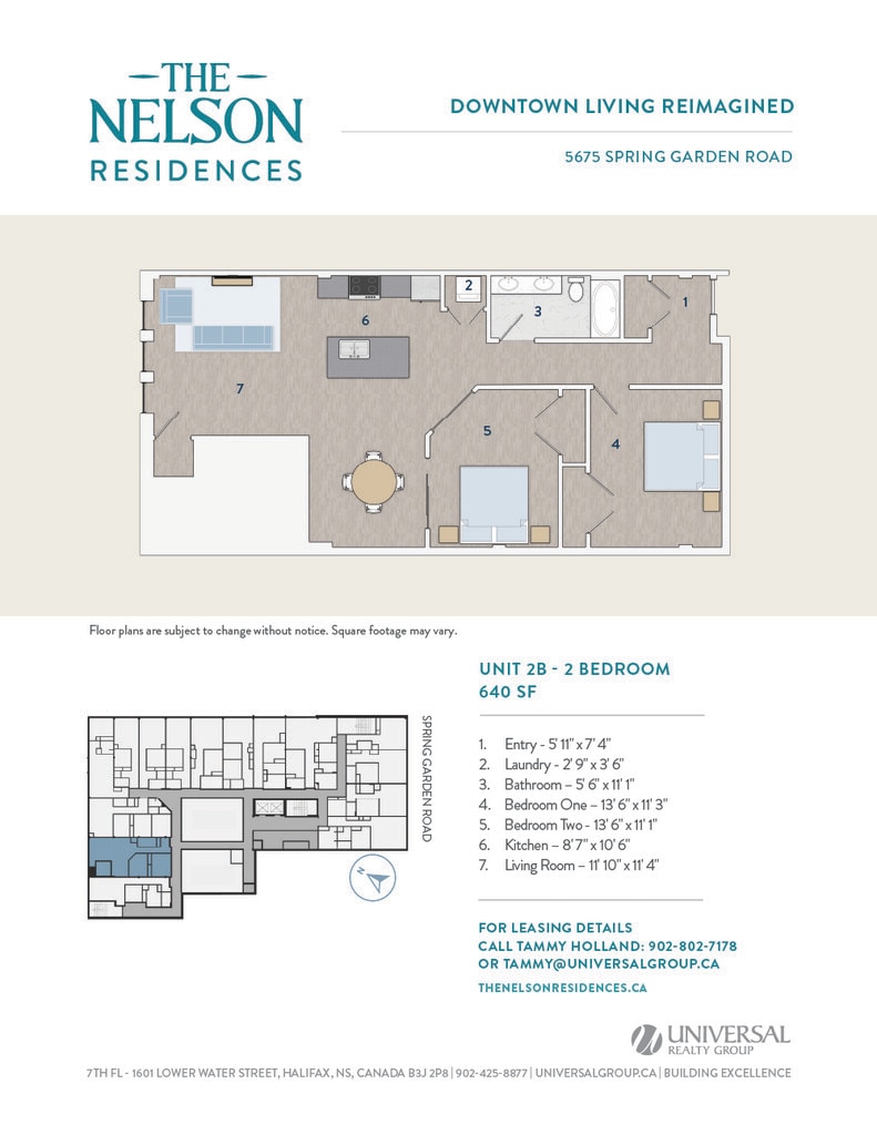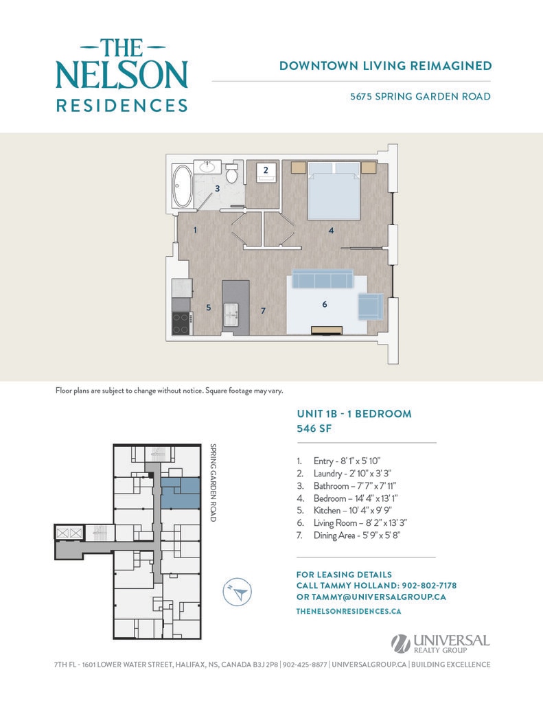 Universal Realty Group is pleased to introduce The Nelson Residences — a distinguished downtown address transformed into stylish and contemporary apartments designed for urban living. In collaboration with the visionary architects at Studioworks, the project redefines the corner of Spring Garden Road and South Park Street, creating a refined, connected living experience at the heart of the city. Opening April 2026, The Nelson Residences offer a fresh perspective on modern city life. Boasting a premier downtown location, The Nelson Residences feature 78 thoughtfully designed apartments, from studios to three-bedroom layouts, with open floor plans and modern kitchens equipped with stainless steel appliances and luxurious finishes. Residents enjoy a curated suite of amenities, including an elegant Club Room, a state-of-the-art Fitness Room, and access to premium services from the adjacent Lord Nelson Hotel & Suites. Covered parking provides added convenience, with direct access to the shops, dining, and services of Park Lane Mall.