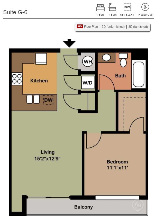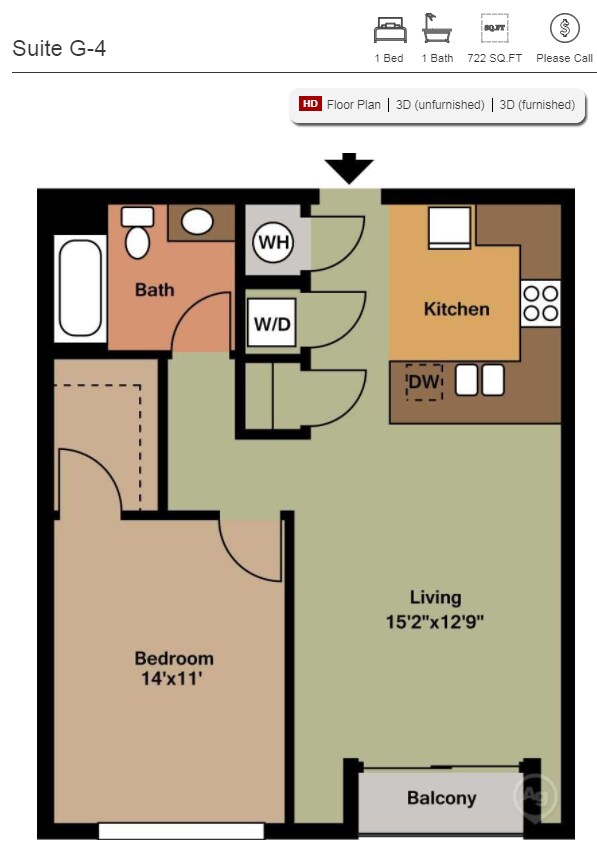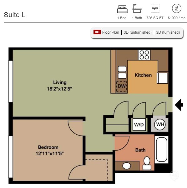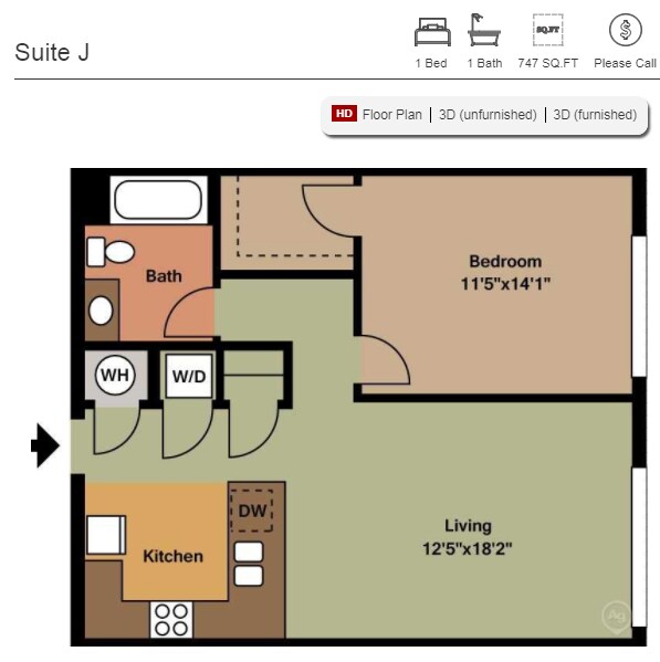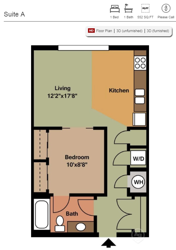 Suite A - Floorplan 1 Apartment Unit: 307Apartment Model: Suite A$2,279Studio, 1 Bath, 552 sq ftAvailable NowStudio